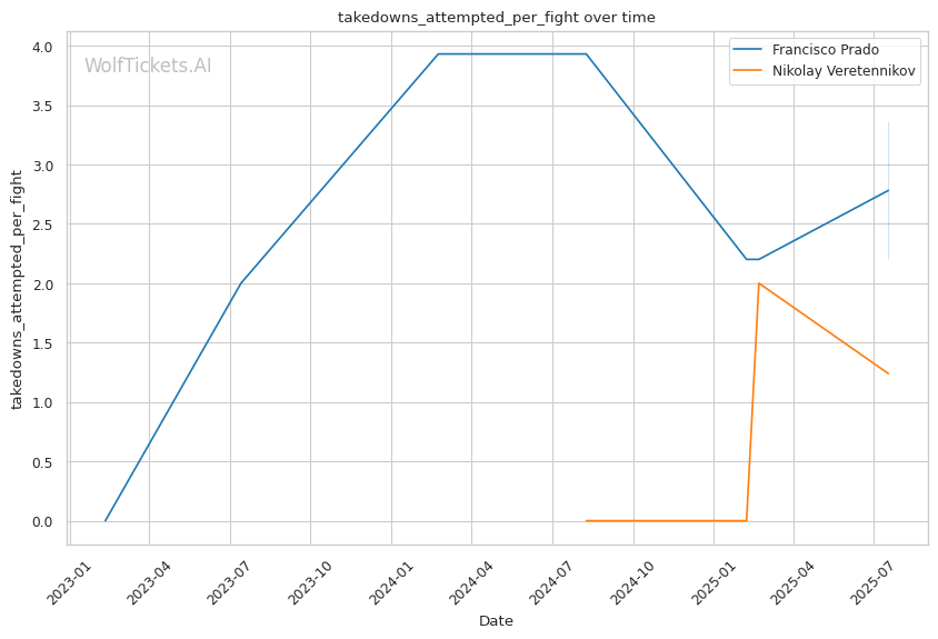 Conversely, Veretennikov's patient counter-striking approach matches well against Prado's aggressive entries. Prado's habit of leading with his head when throwing power shots plays directly into Veretennikov's strength of timing counters against overcommitted attacks. Veretennikov's ability to remain composed under pressure, shown against Vanderford, could frustrate Prado's preferred aggressive rhythm.