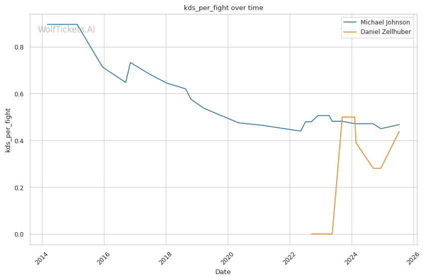 WolfTicketsAI has a mixed record with both fighters. For Johnson, the model correctly predicted his knockout of Azaitar (0.63 confidence) and his TKO of Alan Patrick (0.74 confidence), but missed on the Diego Ferreira fight where Johnson was stopped. The model has been more accurate with Zellhuber recently, correctly predicting his wins over Francisco Prado (0.67 confidence) and Christos Giagos (0.73 confidence), though it missed the close split decision loss to Ribovics despite 0.69 confidence.