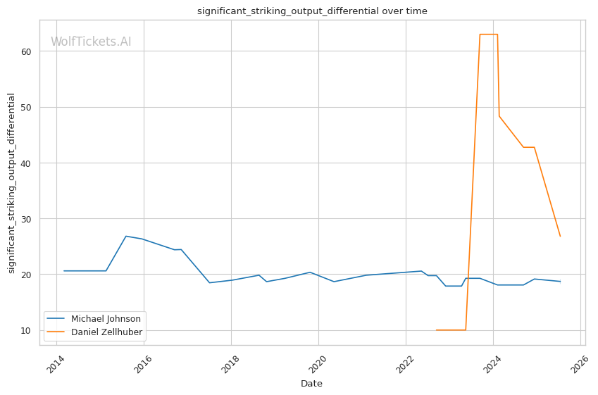The model's confidence stems from several key statistical factors. Recent Win Percentage increased the score by 3 points, reflecting Zellhuber's 67% recent win rate compared to Johnson's similar mark. Win Streak Difference added 2 points, with Zellhuber riding momentum from recent victories. Multiple striking differentials—Significant Striking Impact, Striking Impact, and Significant Striking Output—each contributed 1 point, highlighting Zellhuber's superior recent striking metrics.