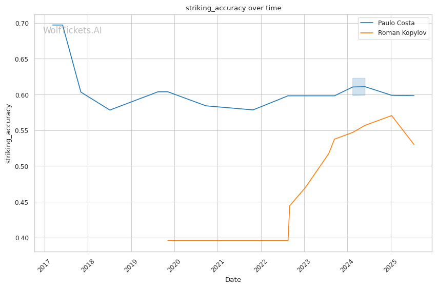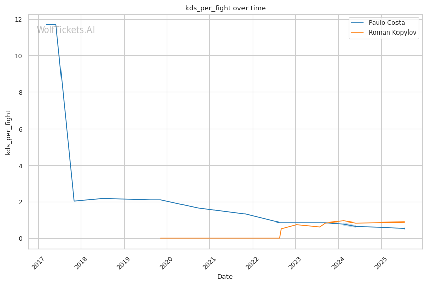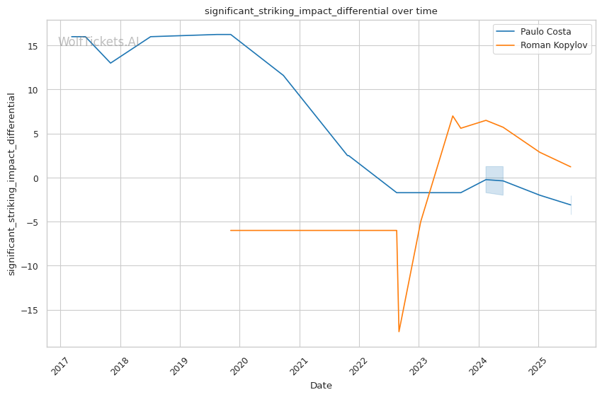 Costa's technical vulnerabilities - particularly his stance integrity issues and limited head movement - align perfectly with Kopylov's counter-striking strengths and left-side weapons. The Russian's inside positioning should neutralize Costa's pressure advantages while creating opportunities for his devastating left straight and kicks. WolfTicketsAI's prediction of Kopylov securing victory reflects both the stylistic matchup favoring the Russian and Costa's recent struggles against technical strikers.