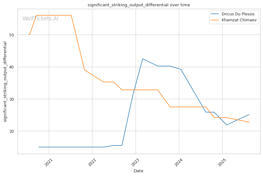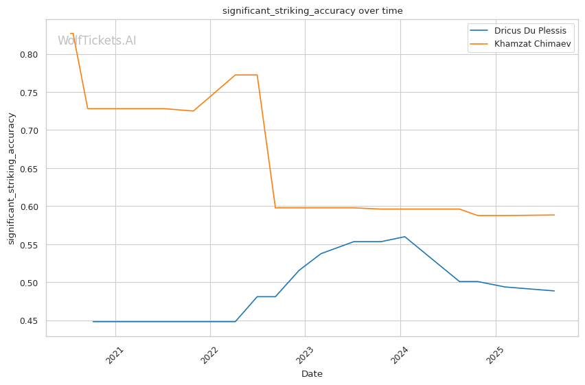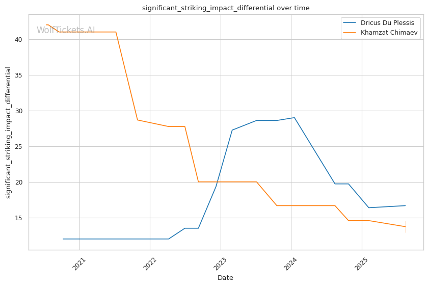 WolfTicketsAI shows mixed results with both fighters. For Du Plessis, the model correctly predicted his victories over Strickland (rematch), Adesanya, Brunson, Till, and Tavares, but incorrectly favored Strickland and Whittaker in their respective fights. This suggests the model initially underestimated Du Plessis's championship-level adaptability. For Chimaev, the model has perfect accuracy, correctly predicting victories over Whittaker, Usman, Holland, and Burns. This perfect record provides strong confidence in the current prediction.