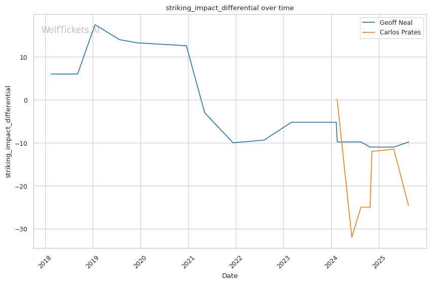 The model heavily favored Prates based on several key factors. Odds decreased the prediction score by 13 points, reflecting Prates' significant betting favoritism. Recent Win Percentage further decreased confidence by 2 points, highlighting Neal's poor recent form at just 33%. However, Striking Impact Differential and Average Striking Output Differential increased the score, suggesting Prates' superior finishing ability and output metrics influenced the prediction positively.