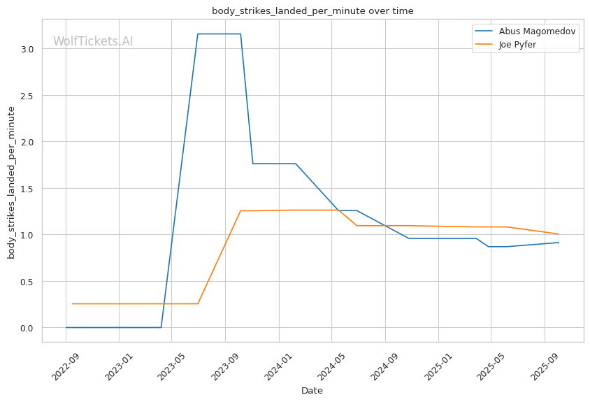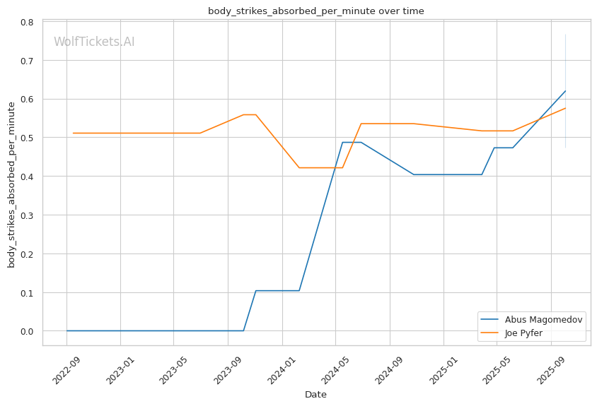 Once gassed, Magomedov shows pronounced vulnerability to body attacks. Against Strickland in round two, he backed away from single, un-set-up body strikes despite being completely exhausted. His defensive shell focuses on head protection, leaving his body exposed—particularly problematic when he's too tired to maintain proper guard positioning. Pyfer lands body strikes at 1.01 per minute and specifically uses body shots to set up his overhand right, creating a perfect technical matchup against Magomedov's defensive gaps.