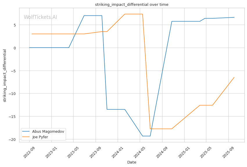 Striking Impact Differential increased the score by 1 point. Pyfer's striking impact differential (-6.5) is actually worse than Magomedov's (6.83), but his recent striking impact differential shows improvement.