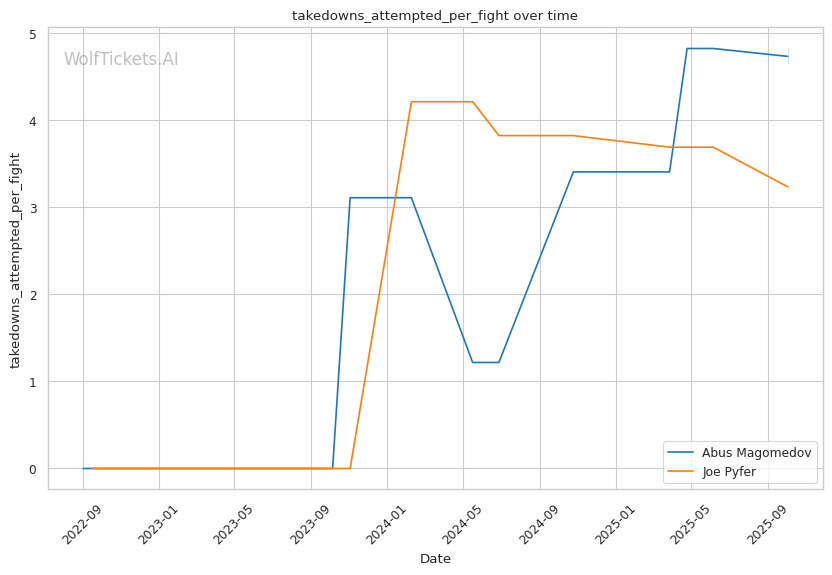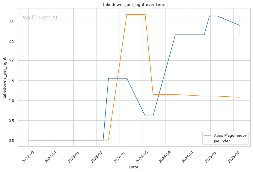 Recent Takedowns Attempted per Fight increased the score by 1 point. Pyfer's recent takedown attempts (3.89 per fight) give him a grappling option that Magomedov can't match.