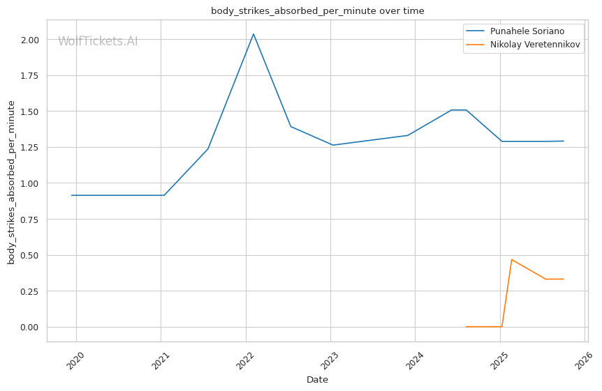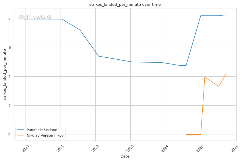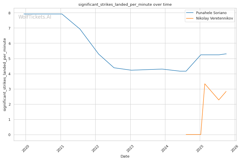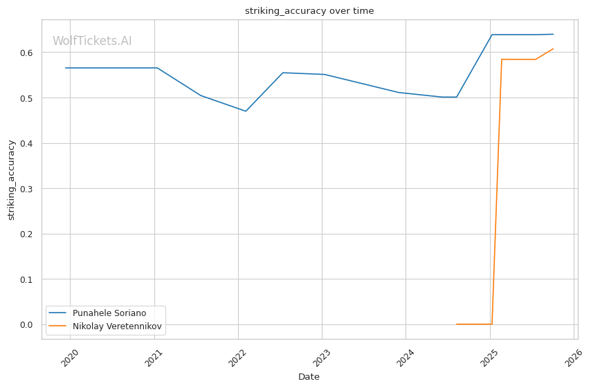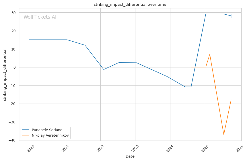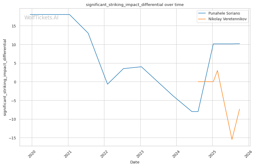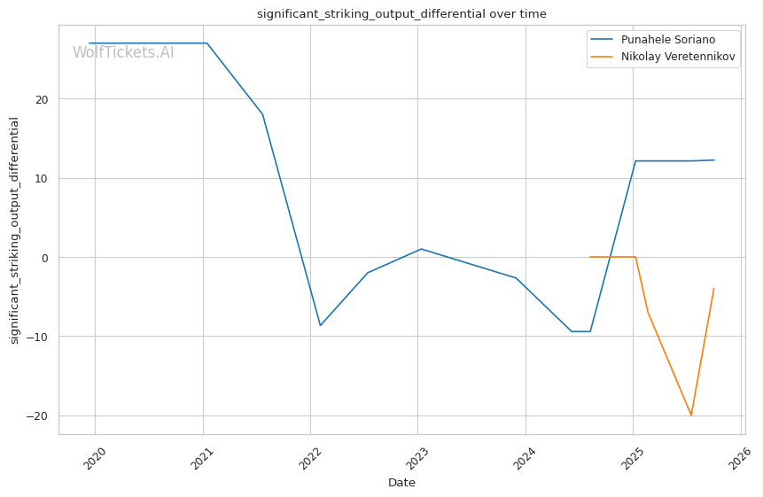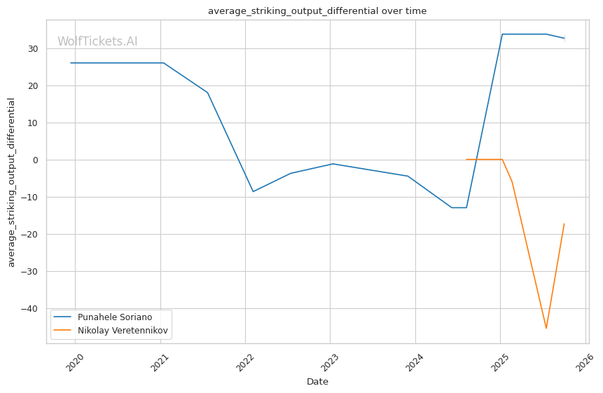 The model accounts for Veretennikov's negative striking differentials (Average Striking Output Differential: -17.33, Recent Significant Striking Impact Differential: -6.08), indicating he consistently gets outstruck and absorbs more damage than he delivers. Soriano's positive differentials (Average Striking Output Differential: +31.56, Significant Striking Impact Differential: +10.22) show he lands more and does more damage.