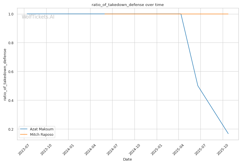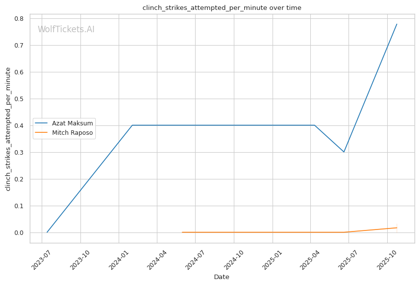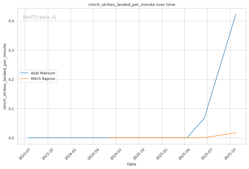Striking Output Differential: Maksum lands 3.24 significant strikes per minute; Raposo lands 1.07. In recent form, Maksum landed 2.79 while Raposo dropped to 1.07. Expect a 40-15 type striking advantage for Maksum across three rounds.