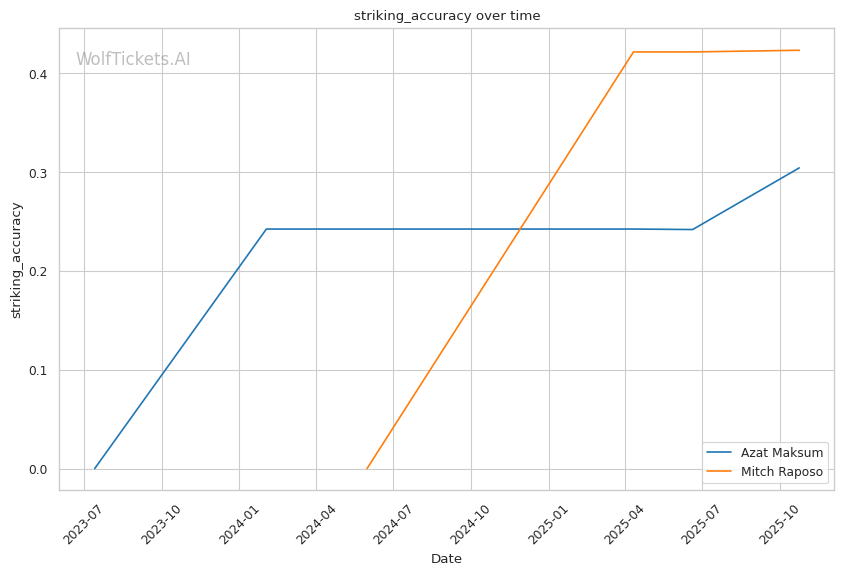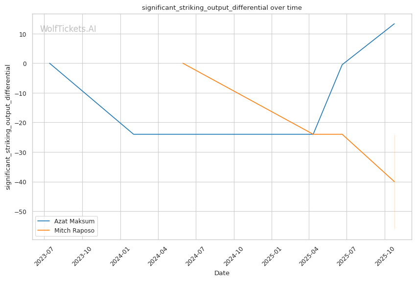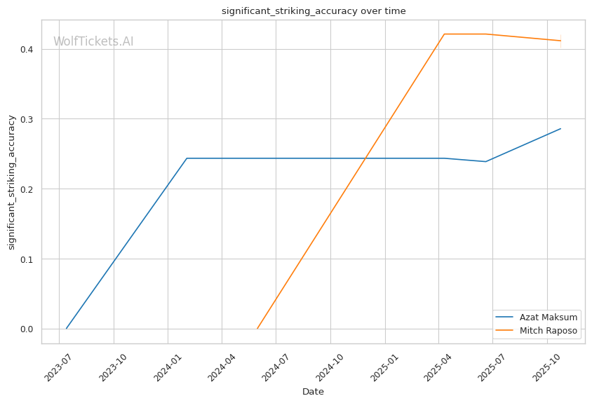 The striking differential is stark. Maksum lands 3.24 significant strikes per minute at 29% accuracy; Raposo lands 1.07 at 25% accuracy with 30% striking defense. Maksum will outlanding him 3-to-1 minimum. Raposo's overhand right—his only proven weapon—requires closing distance through Maksum's front kick range, then past his jab, then surviving the right hand counter. That's a low-percentage path against a fighter with 52% striking defense who just went 15 minutes with a ranked opponent.