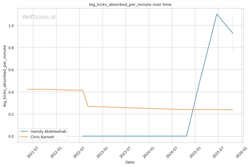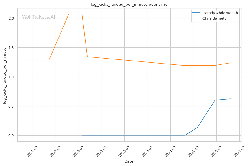 Abdelwahab's calf kicks will accelerate Barnett's structural breakdown. Barnett's legs are already compromised; systematic low kicks will make his explosive lunging entries even more dangerous to attempt. Against Usman, those opening-round calf kicks nearly knocked him over—Barnett's knees won't survive similar accumulation.