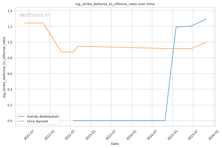 The model's confidence in Abdelwahab stems primarily from the odds differential (+19 to the prediction score), reflecting the massive -390 line on the Egyptian. Striking Defense Percentage added +4, highlighting Abdelwahab's 50.82% defense rate compared to Barnett's catastrophic 34.92%—a 16-point gap that suggests Abdelwahab will land more cleanly if this stays standing.