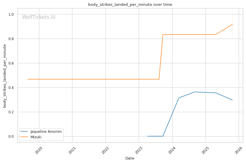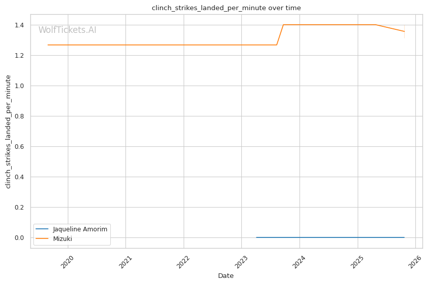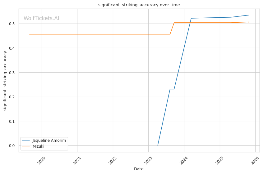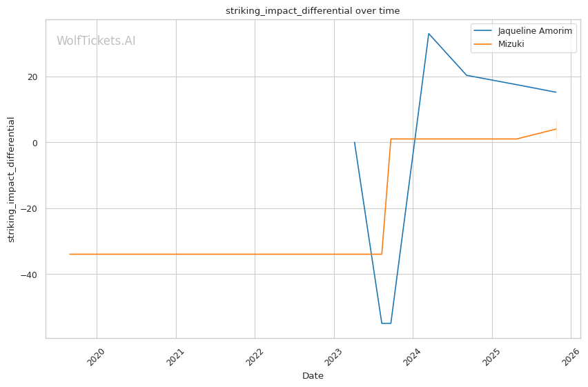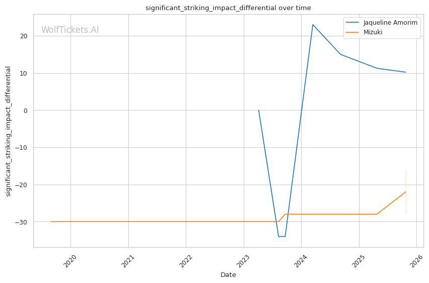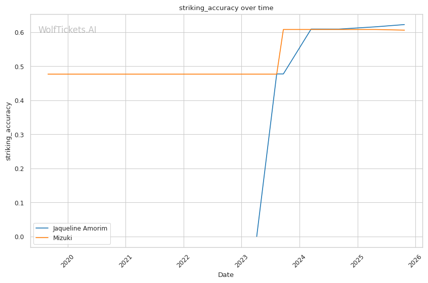 The striking matchup heavily favors Amorim despite neither being a striker. Amorim's 52% significant striking accuracy and willingness to use strikes to set up takedowns gives her an entry path. Mizuki's 50.87% accuracy and zero knockout power means she can't keep Amorim at distance through threat of damage. When Amorim landed counter right hands against McKenna before jumping guard, it showed she can time entries off striking exchanges.