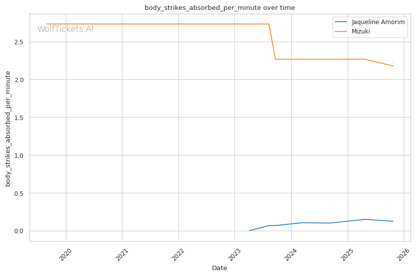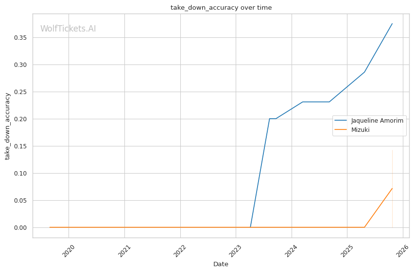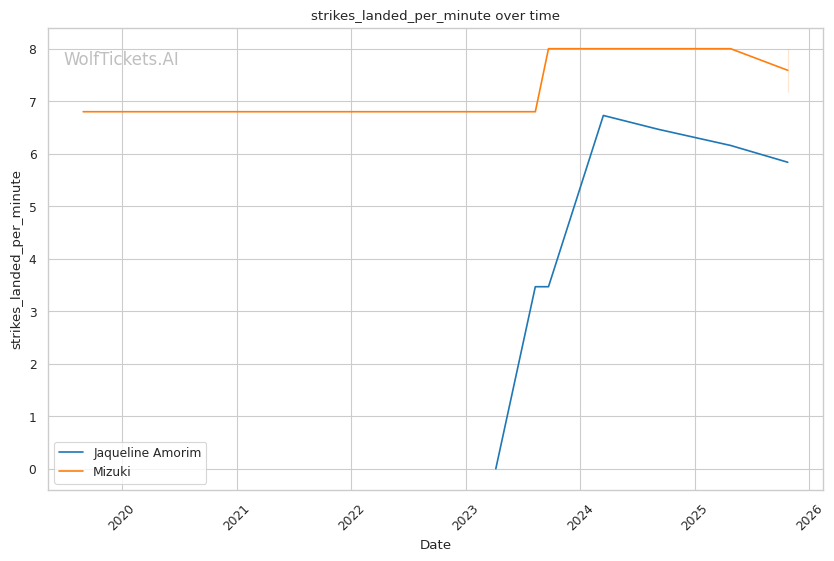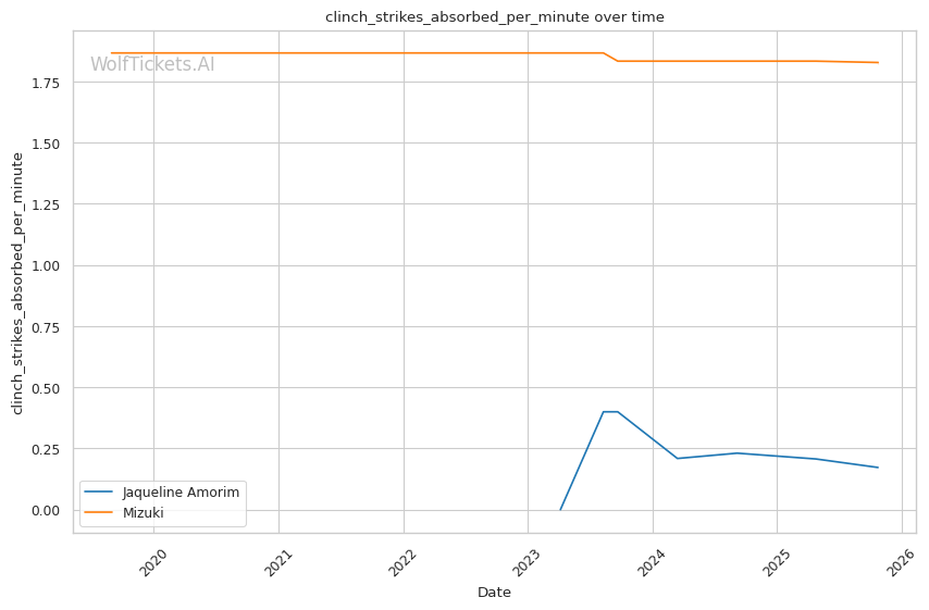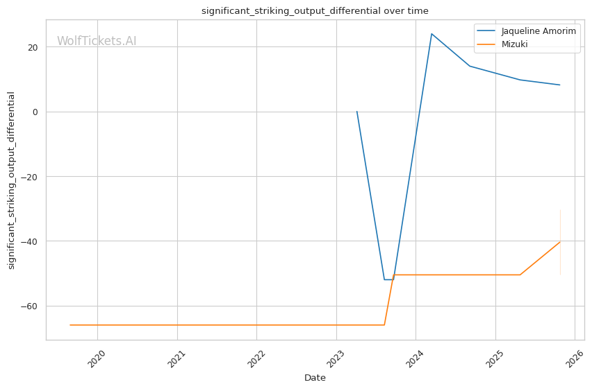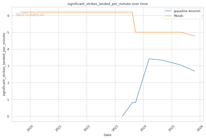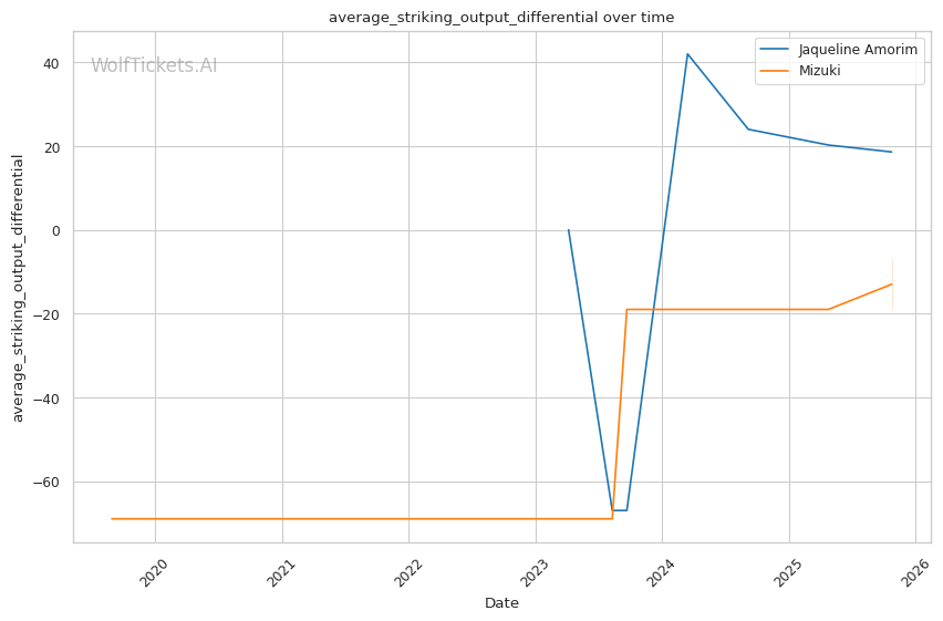 The striking matchup heavily favors Amorim despite neither being a striker. Amorim's 52% significant striking accuracy and willingness to use strikes to set up takedowns gives her an entry path. Mizuki's 50.87% accuracy and zero knockout power means she can't keep Amorim at distance through threat of damage. When Amorim landed counter right hands against McKenna before jumping guard, it showed she can time entries off striking exchanges.