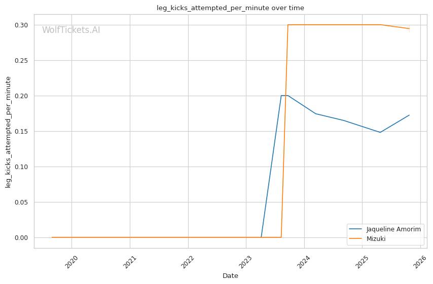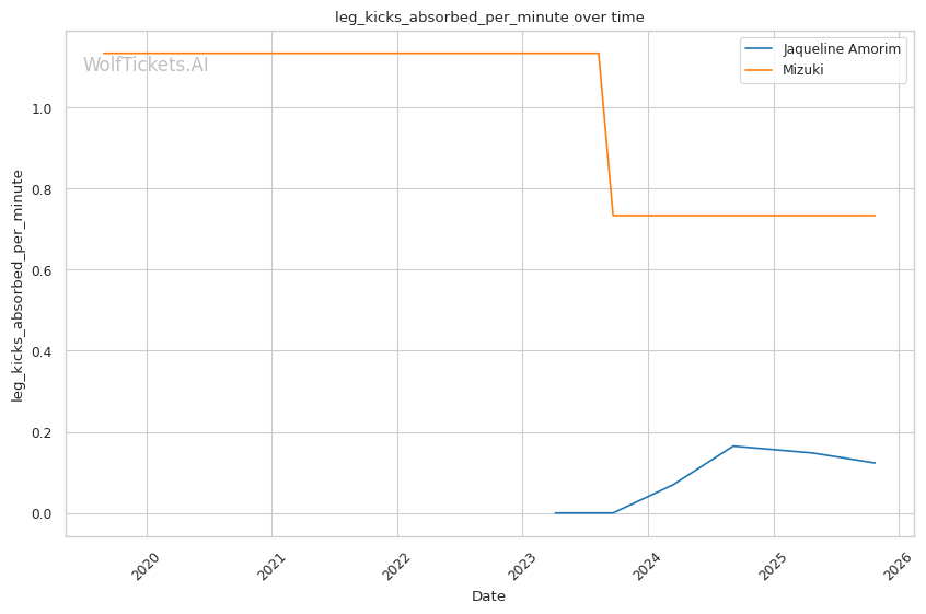 Early Round 1: Amorim will likely replicate her recent pattern—minimal feeling-out process, then an explosive takedown within the first 30-60 seconds. Mizuki's 17.65% takedown defense means she'll probably end up on her back quickly. If Mizuki tries leg kicks to maintain distance (as she did against Wu Yanan), Amorim will catch one and drag her down, exactly like she did to Demopoulos.