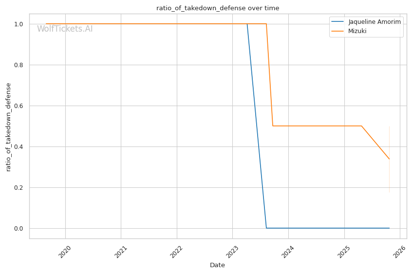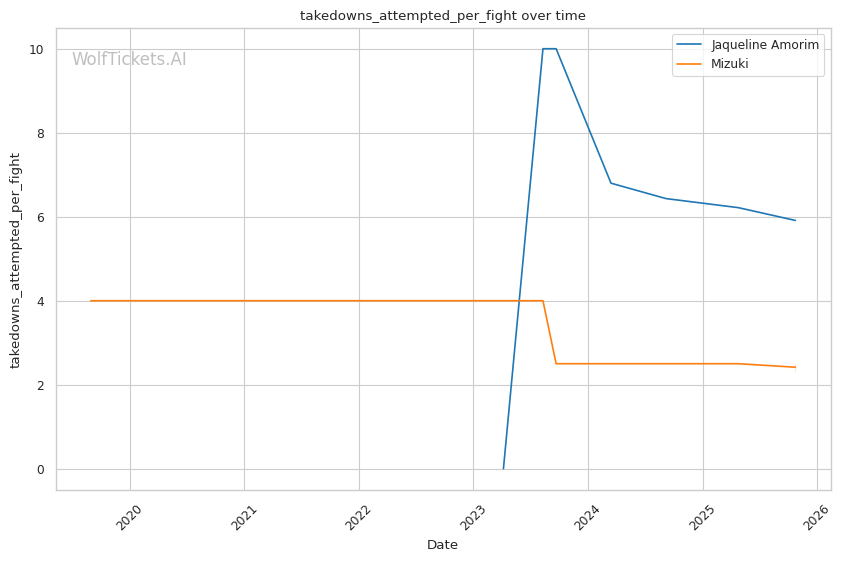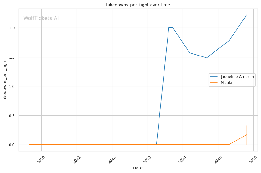 This is a grappler vs. grappler matchup where one fighter has world-championship credentials and the other has struggled to implement her ground game in the UFC. Amorim's explosive takedown entries directly counter Mizuki's poor takedown defense (17.65% defense rate). When Amorim shot on Viana within five seconds, Viana had no answer. When she caught Demopoulos' kick, the fight immediately went to the ground. Mizuki's tendency to stay mobile on the outside and throw leg kicks plays directly into Amorim's game—she'll catch a kick or close distance for a double-leg.