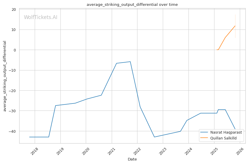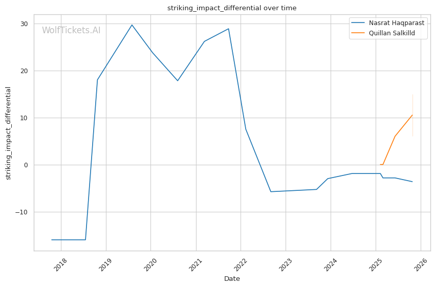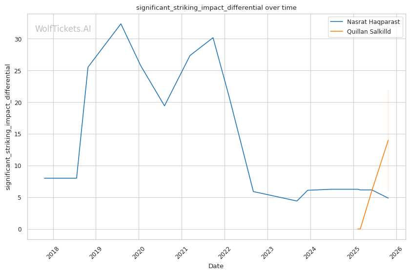 Recent Significant Striking Impact Differential and Recent Striking Impact Differential each increased the score by 1.0—Haqparast's +6.33 and -3.08 recent differentials indicate he's landing more significant strikes than absorbing. Salkilld's +10.27 and +7.7 differentials look strong but come from limited sample size (two UFC fights, one lasting 19 seconds).