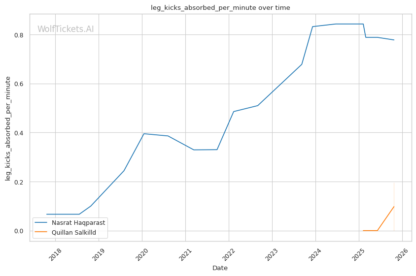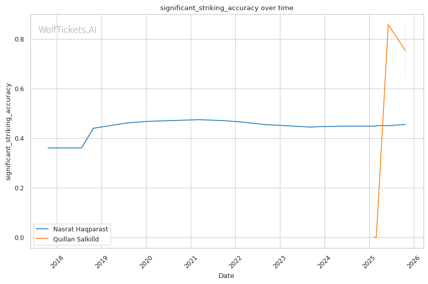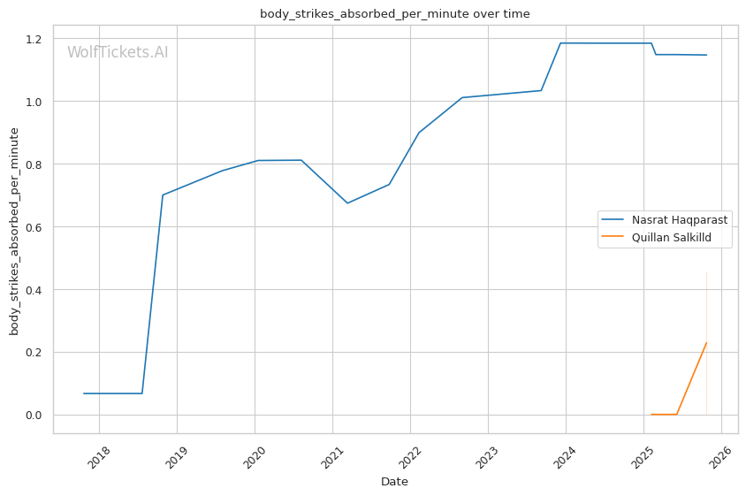 Defensive Striking Gaps Under Pressure: Salkilld stops only 48.1% of significant strikes, well below elite standards. Against Ashmouz, he absorbed heavy calf kicks and a right hand that visibly hurt him in Round 3. His strike defense to offense ratio of 0.44 indicates he's taking significant damage when exchanges occur. Haqparast's recent 69.95% significant striking defense and 1.77 recent strike defense to offense ratio suggest he'll land cleaner and more frequently in striking exchanges.
