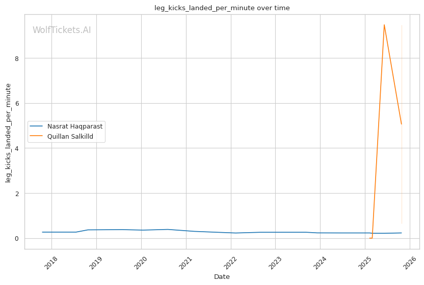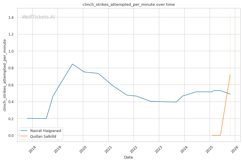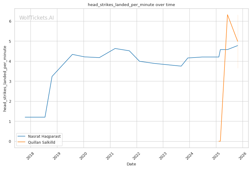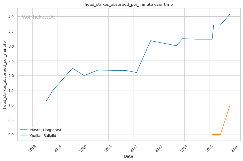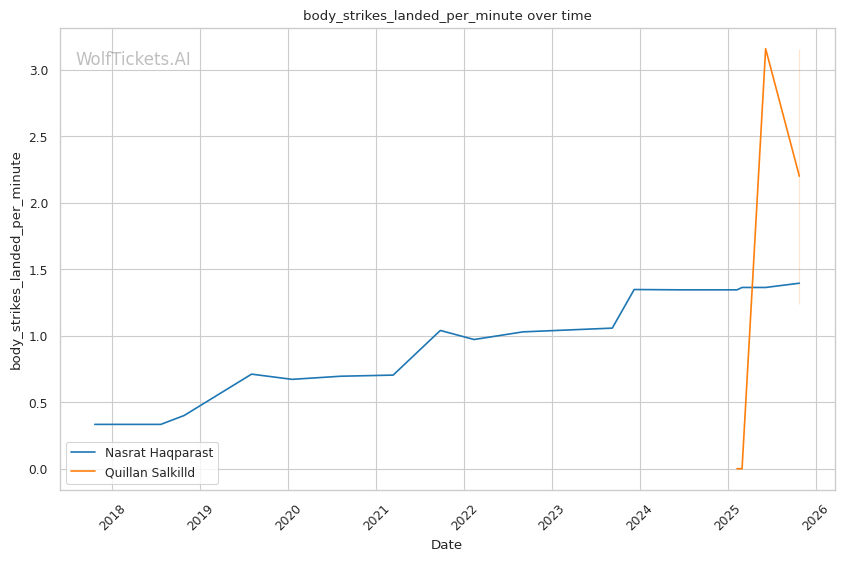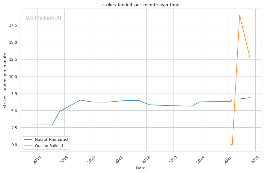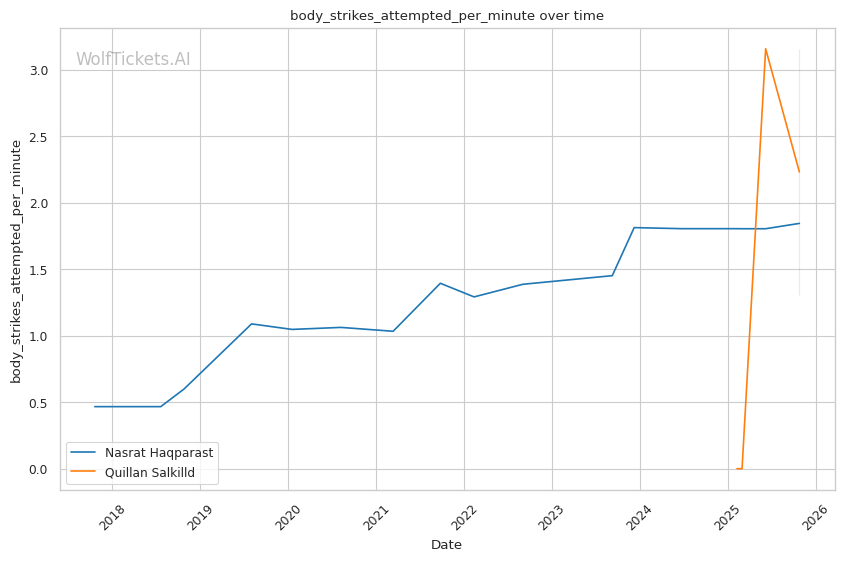Cardio and Pace: Haqparast's ability to maintain 7.27 strikes per minute over three rounds contrasts with Salkilld's Round 3 fatigue. In a sustained striking battle, Haqparast's conditioning and output overwhelm Salkilld.