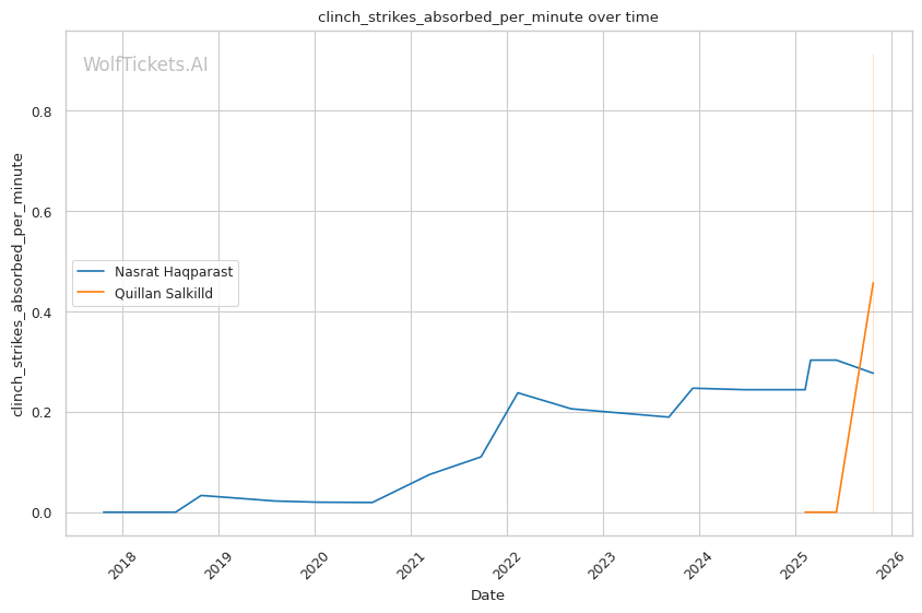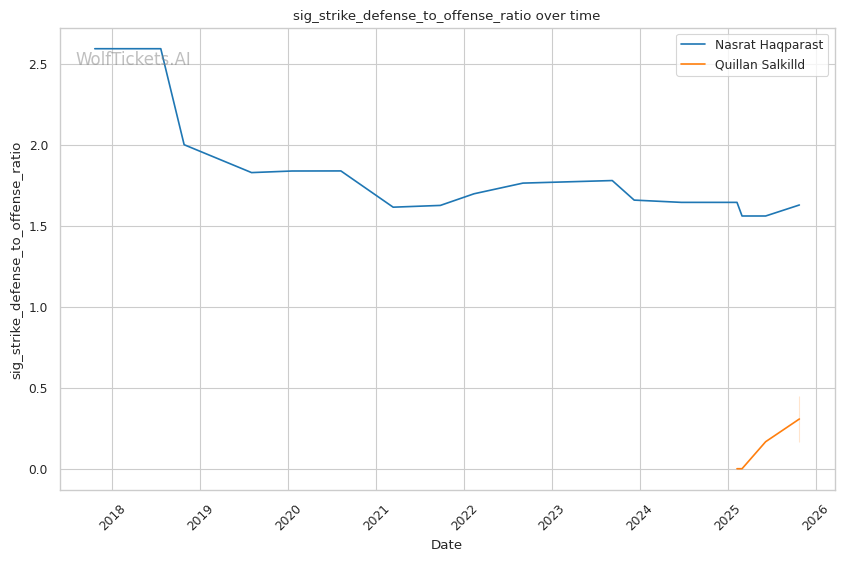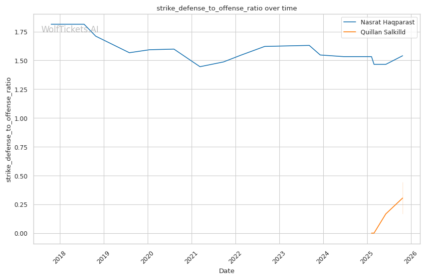 Defensive Metrics Favor Haqparast: 69.95% recent significant striking defense vs 48.1% for Salkilld. 1.77 recent strike defense to offense ratio vs 0.44 for Salkilld. These gaps suggest Haqparast will land cleaner while absorbing less damage.