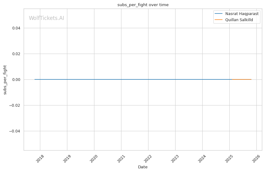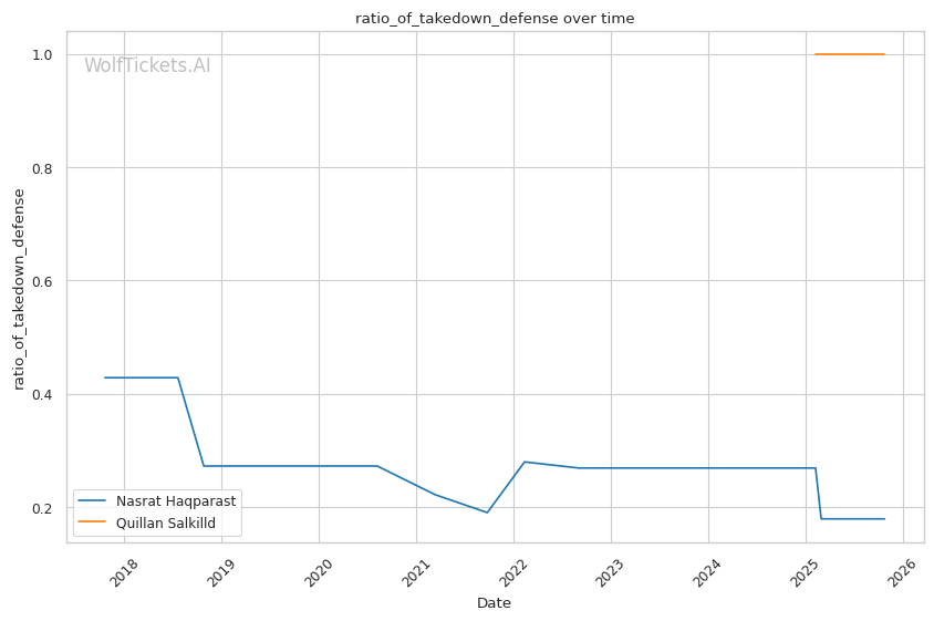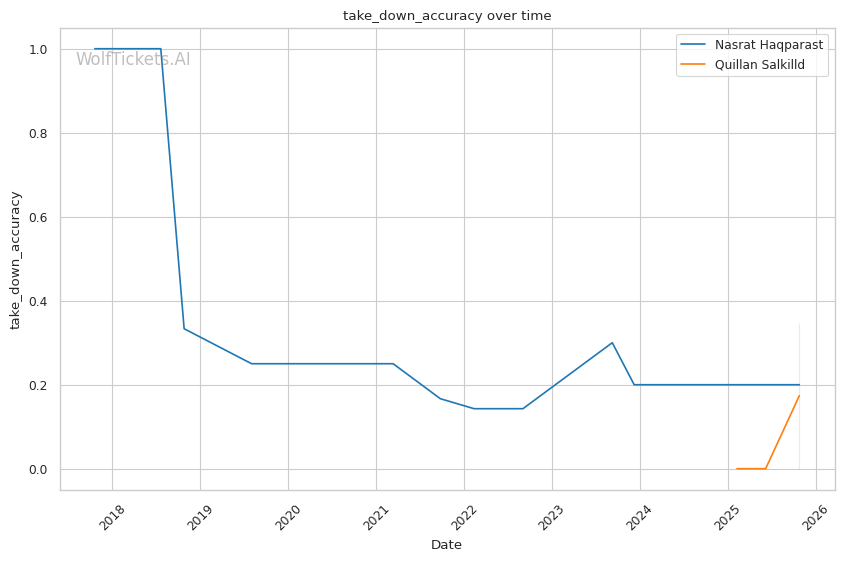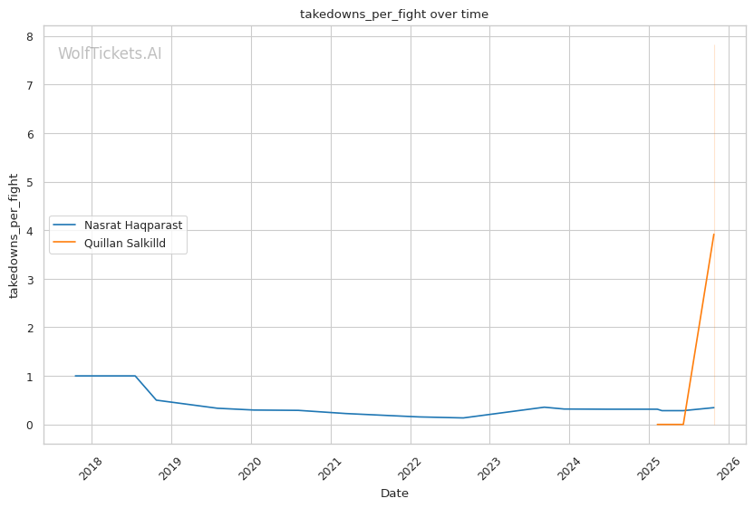 Over-Reliance on Wrestling as Safety Net: Against Ashmouz's power, Salkilld pivoted to a grappling-heavy approach rather than engaging in his preferred striking game. This suggests discomfort standing with dangerous strikers. Haqparast's 82.05% takedown defense (72.94% recently) and low takedown attempts against him (1.73 per fight) indicate opponents struggle to implement wrestling-heavy gameplans. If Salkilld can't establish takedowns early, he may be forced into the striking exchanges where his defensive gaps become exploitable.