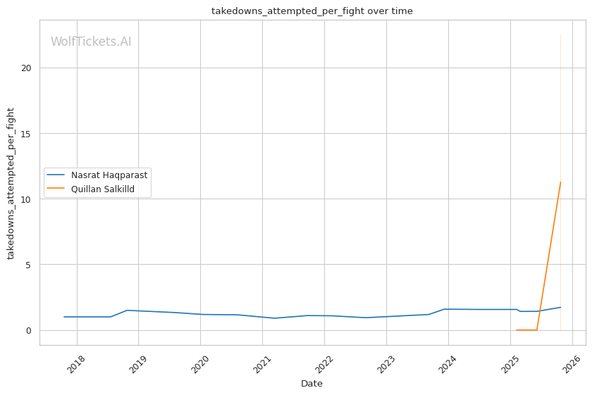 Recent Takedowns Attempted per Fight decreased the score by 1.0—Salkilld's 8.26 recent attempts vs Haqparast's 1.73 suggests Salkilld may attempt wrestling, but Haqparast's 82% takedown defense makes this a low-probability path to victory.