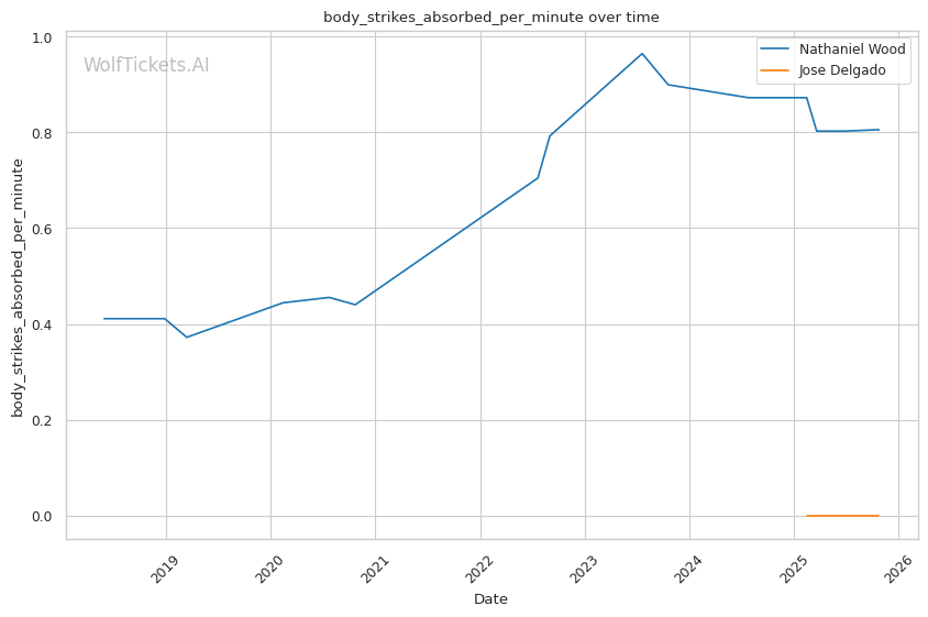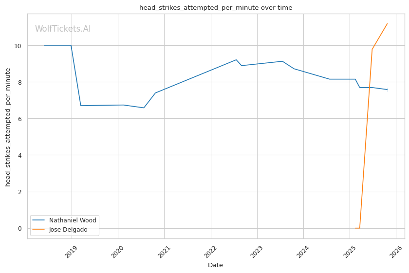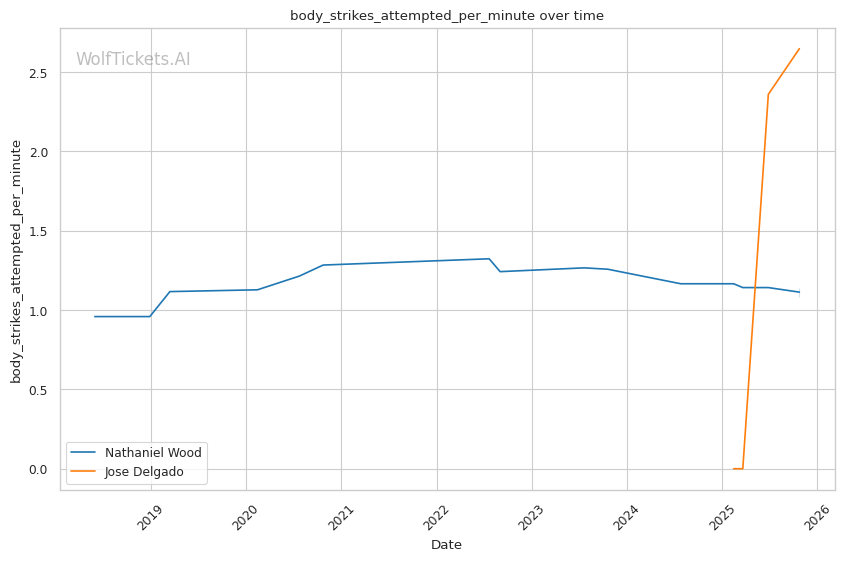 Reduced Technical Variety and Head-Hunting Focus: Delgado shows minimal evidence of systematic leg kicks, body punches beyond setups, or level changes. His offense is primarily head-hunting oriented. Against Matthews, there was limited body work or low kicks. This one-dimensional targeting makes him predictable for counter-strikers like Wood who excel at reading intentions. The 0.29 leg kicks landed per minute and 2.35 body strikes landed per minute confirm he's hunting the head primarily, which plays directly into Wood's counter-striking wheelhouse if Wood can survive the early exchanges.