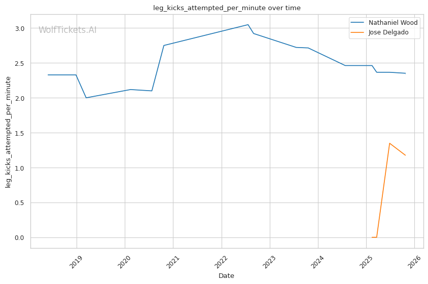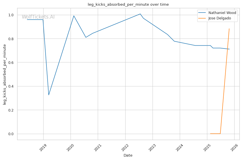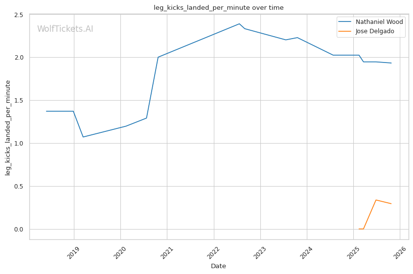 Wood's low calf kicks—which destroyed Pineda's mobility and forced Rosa to change stances repeatedly—target Delgado's minimal leg kick defense (0.88 leg kicks absorbed per minute suggests limited experience defending them). Delgado's constant stance-switching could actually make him more vulnerable to calf kicks, as weight distribution shifts during transitions create opportunities for Wood to land clean on the planted leg.