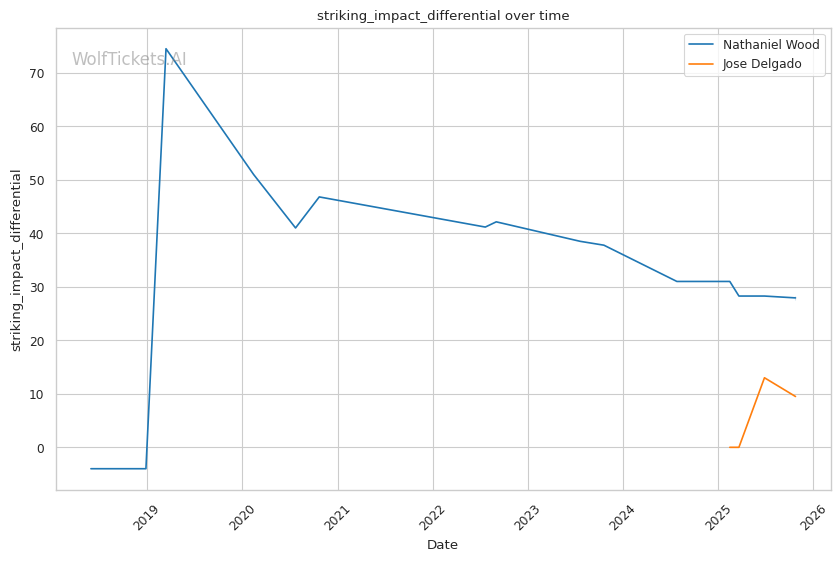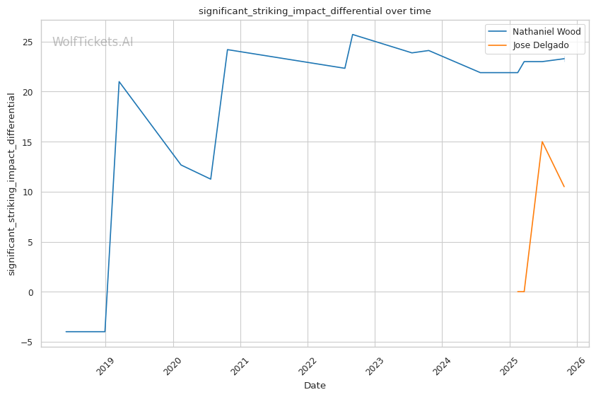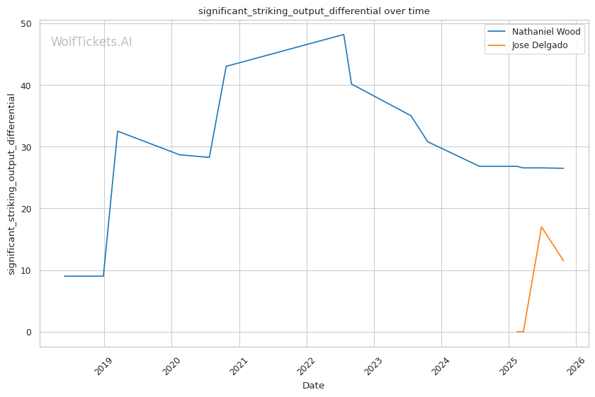 Recent Takedowns Attempted per Fight increased the score by 2.0 - Wood's 3.56 recent takedown attempts versus Delgado's 1.62 suggests Wood may try to grapple, but Delgado's 100% takedown defense (limited sample) could neutralize this.