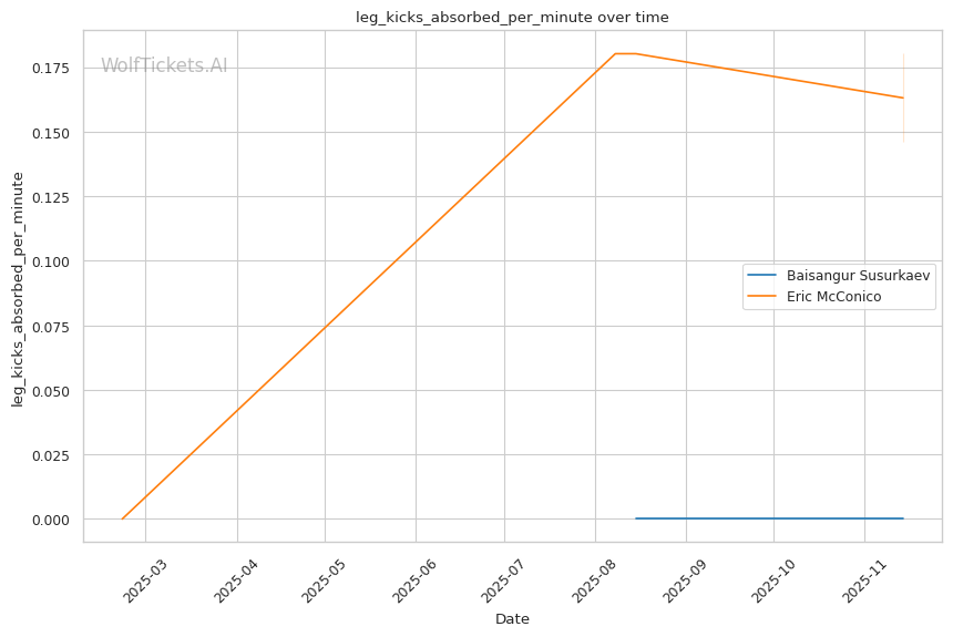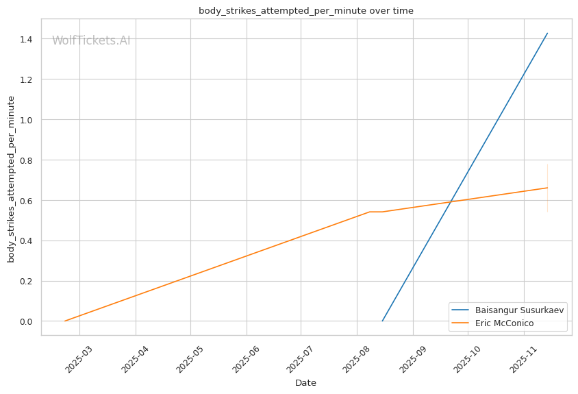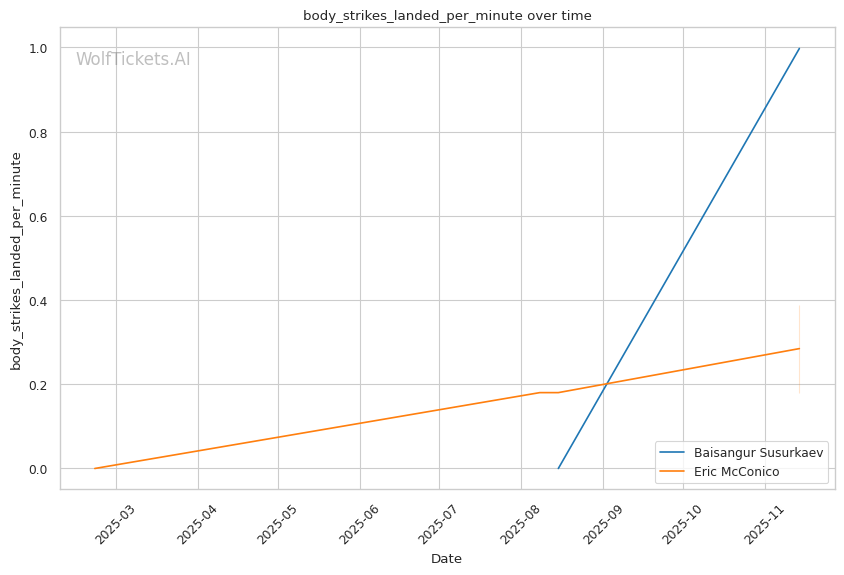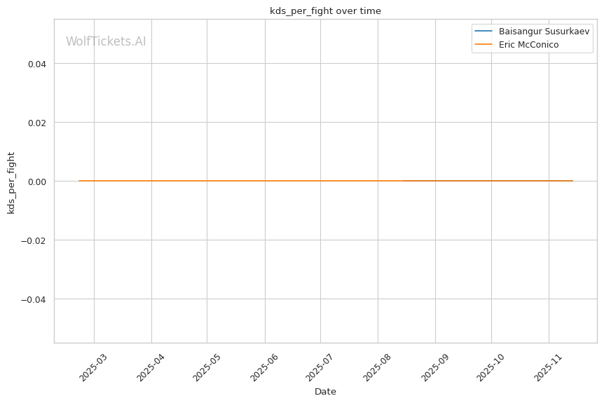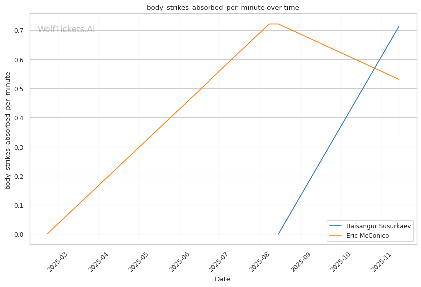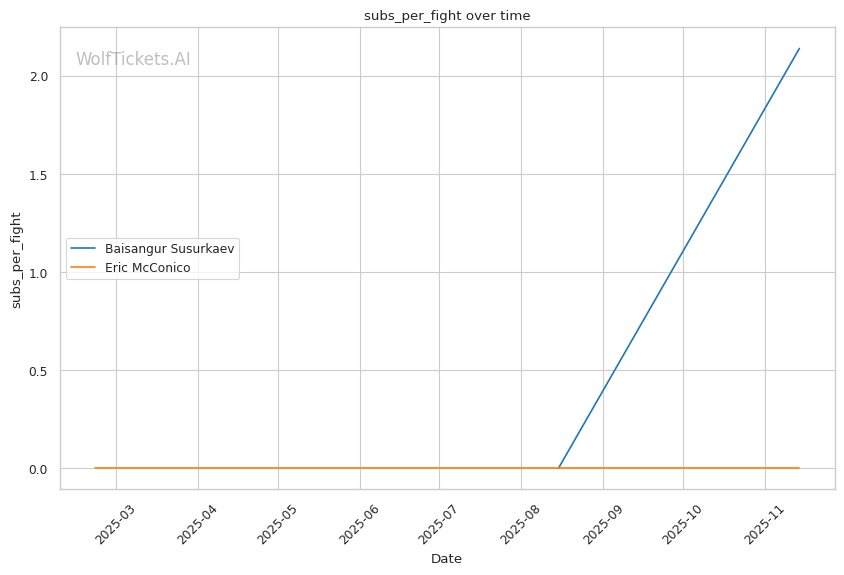 Susurkaev's submission threat increases as McConico fatigues. With 2.14 submissions per fight and McConico's deteriorating defensive awareness late in fights, a finish becomes increasingly likely if the fight extends.