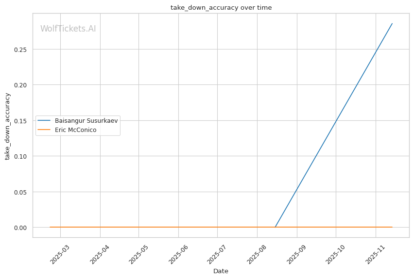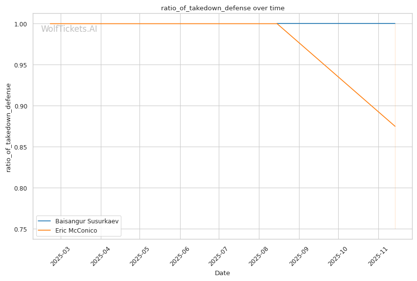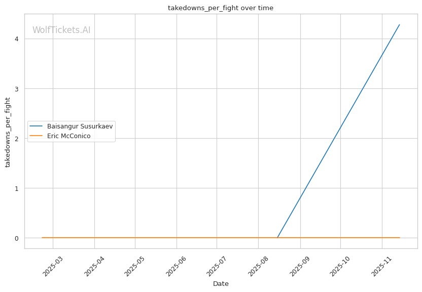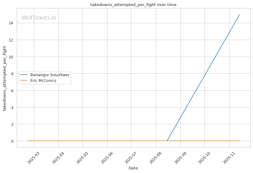 McConico attempts zero takedowns per fight and has 0% takedown accuracy. Against a wrestler like Susurkaev who averages nearly 15 takedown attempts per fight, McConico has no offensive wrestling to threaten or create respect. His 84.33% recent takedown defense won't hold up against sustained wrestling pressure, especially as he fatigues.