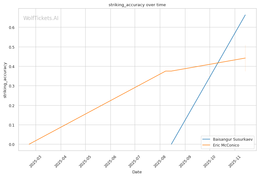 Once Susurkaev secures his first takedown, the fight's trajectory becomes clear. McConico will scramble back up, but the repeated defensive wrestling will accumulate fatigue. Susurkaev's 66.29% striking accuracy and 5.13 significant strikes per minute will allow him to land consistently between wrestling entries.