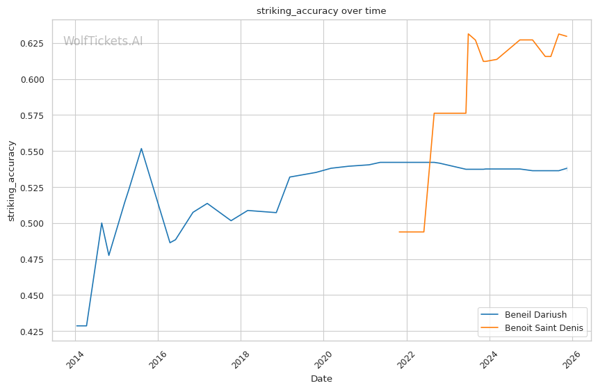 The pattern shows the model recognizes Saint Denis's finishing ability but has overestimated him against elite competition. Conversely, it has struggled to predict Dariush's recent decline, particularly his knockout losses. Given Dariush's current trajectory and Saint Denis's momentum, this prediction aligns with observable technical realities.