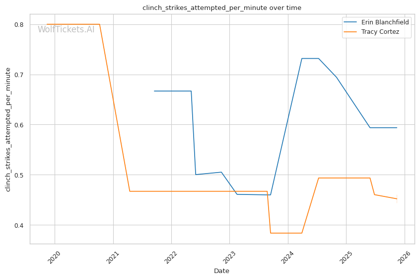 Striking sophistication gap: Blanchfield lands 5.24 significant strikes per minute at 44.4% accuracy with 59.1% defense. Cortez lands 3.71 at 48.9% accuracy with 58.0% defense. While Cortez's accuracy is slightly better, Blanchfield's volume and defensive metrics are superior. More importantly, Blanchfield's striking serves her grappling setups, while Cortez's striking exists to force clinches where she'll be outclassed.