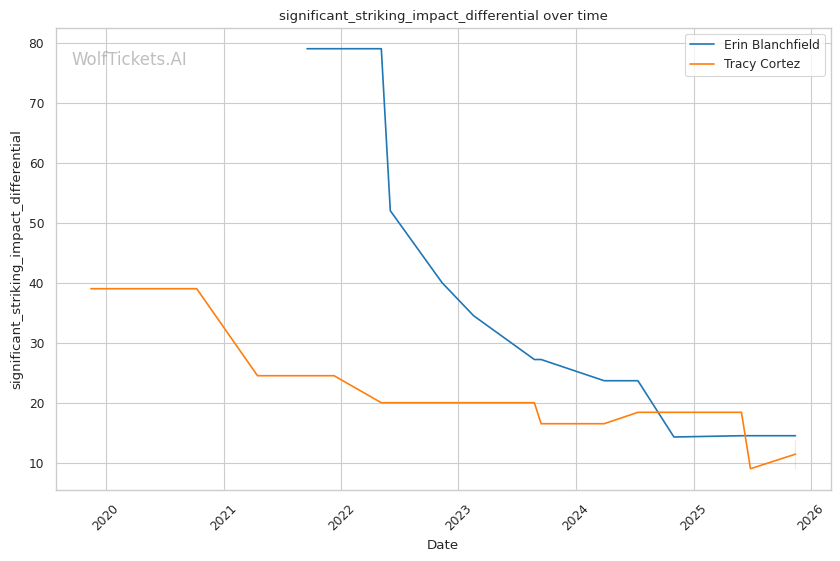 Recent Significant Striking Impact Differential contributed 2 points. Blanchfield's +15.87 recent differential significantly outpaces Cortez's +15.13, indicating Blanchfield lands harder shots while absorbing less damage in recent fights.