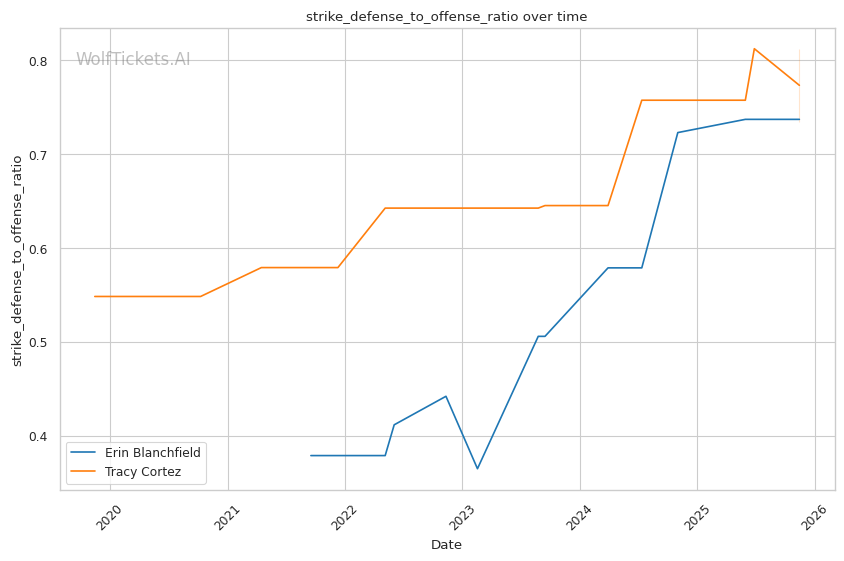 Striking Defense Percentage added 1 point. Blanchfield's 55.4% defense slightly edges Cortez's 51.1%, but more importantly, Blanchfield's defense improves to 60.5% in recent fights while Cortez's rises to 57.4%—both improving, but Blanchfield maintaining an edge.