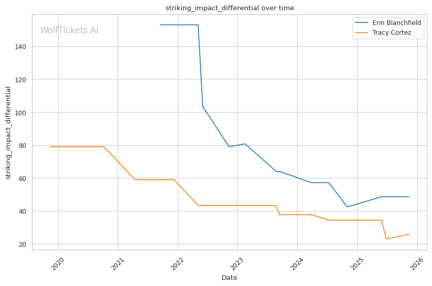 Significant Striking Impact Differential added 1 point, with Blanchfield's +14.50 overall mark edging Cortez's +13.86. This reflects Blanchfield's ability to win striking exchanges across her career.