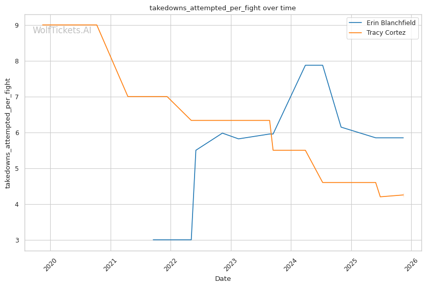 Recent Takedowns Attempted per Fight increased the score by 1 point. Blanchfield's 6.54 recent attempts per fight shows her relentless wrestling pressure, which the model recognizes as crucial against Cortez's defense.