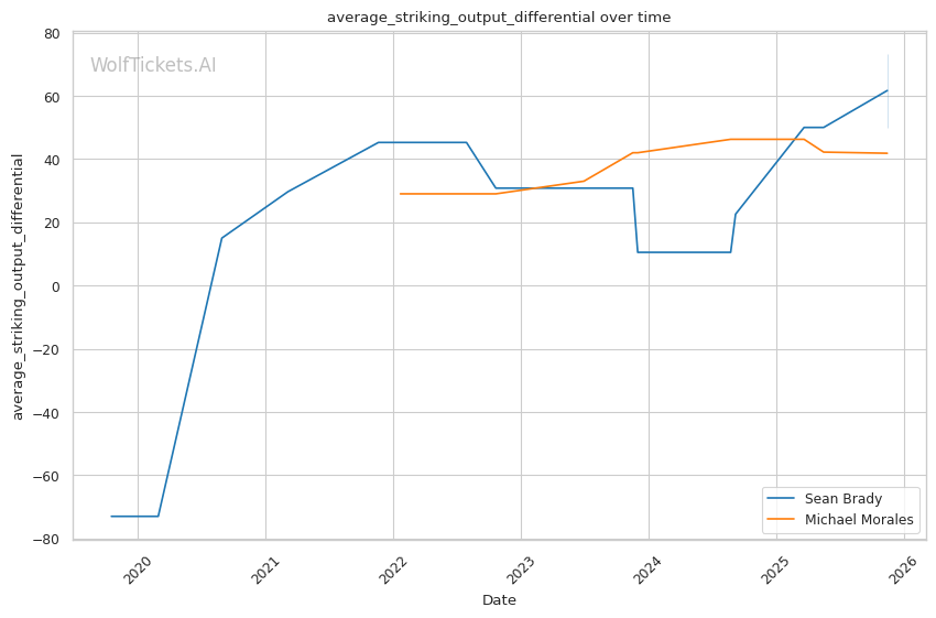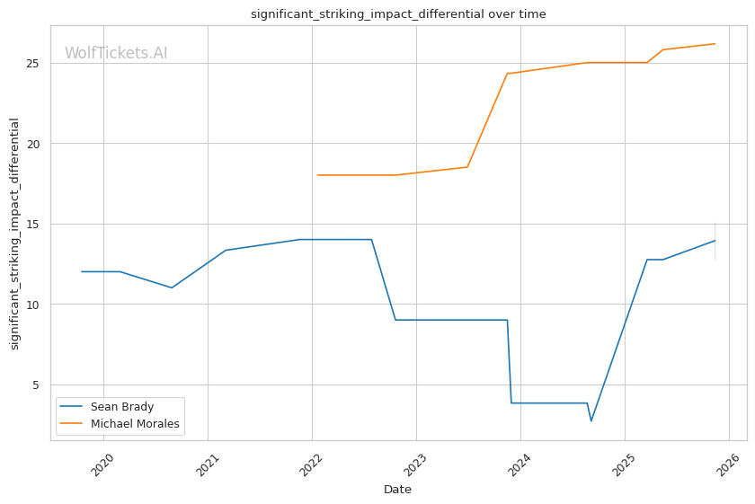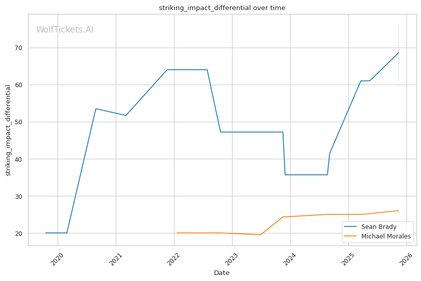Recent Takedowns Attempted per Fight boosted the score by 2 points—Brady's 6.99 attempts per fight recently versus Morales' 1.34 attempts demonstrates the grappling volume disparity. Striking Impact Differential added 2 points, favoring Brady's systematic approach over Morales' power-punching style.