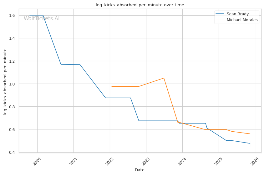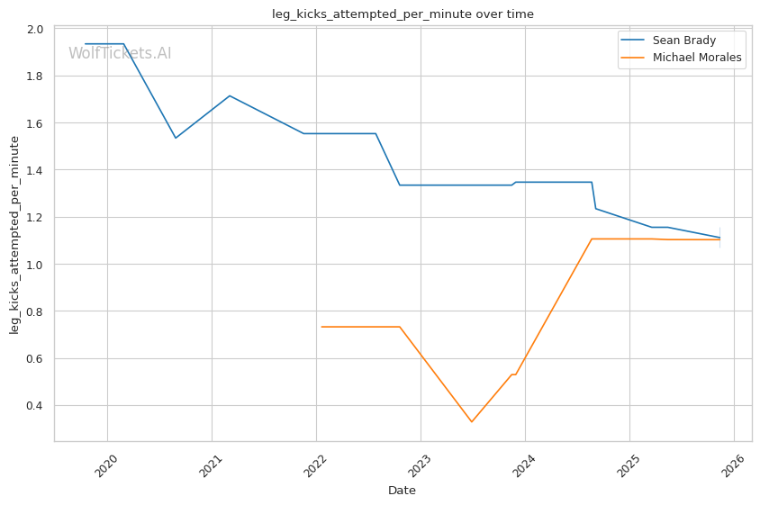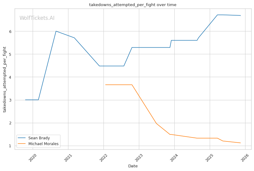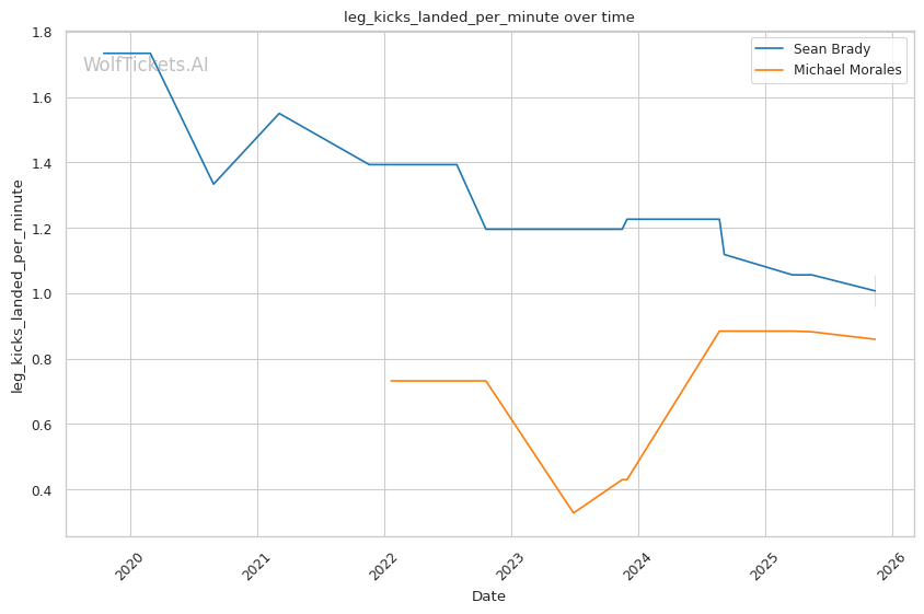 Morales' inside shin kicks—effective against Matthews and Magny—won't deter Brady's wrestling-first approach. Brady's low kicks serve a different purpose: creating checking reactions that freeze opponents momentarily, opening windows for explosive shots. Morales hasn't faced anyone who chains takedown attempts like Brady (6.7 attempts per fight recently).
