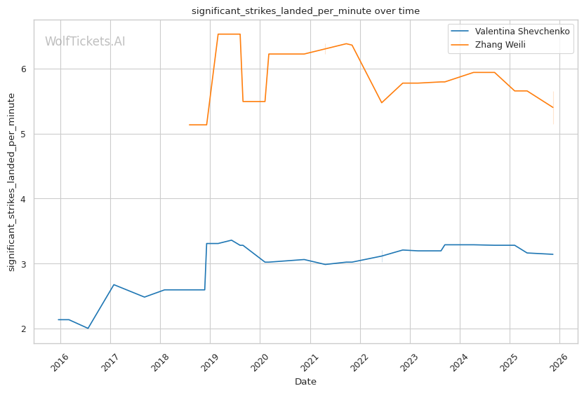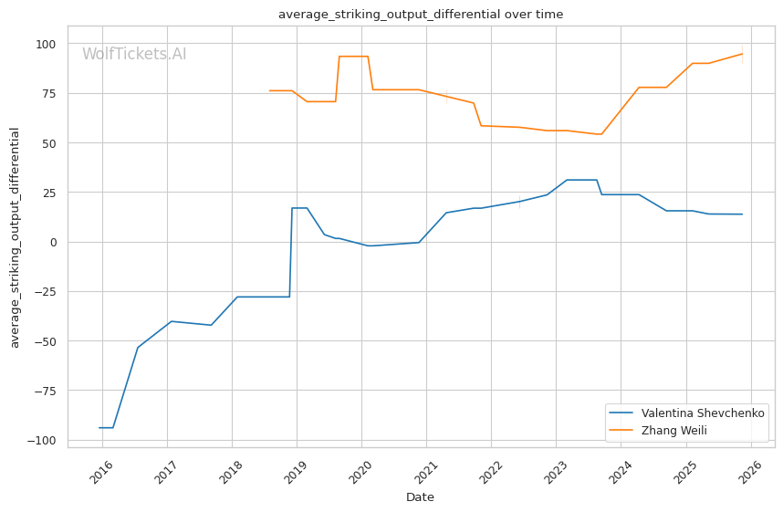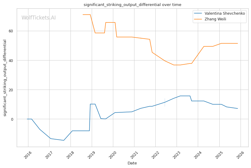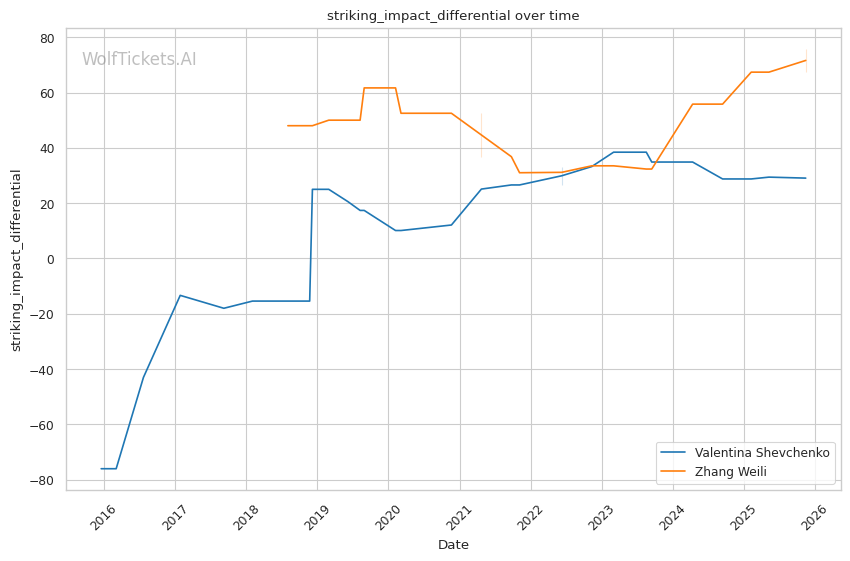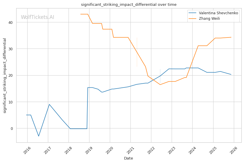 Recent significant striking impact differential decreased the score by 1.0: Weili's +36.55 versus Shevchenko's +23.01 shows Weili lands more significant strikes relative to what she absorbs—directly contradicting Shevchenko's precision-over-volume approach.