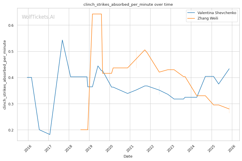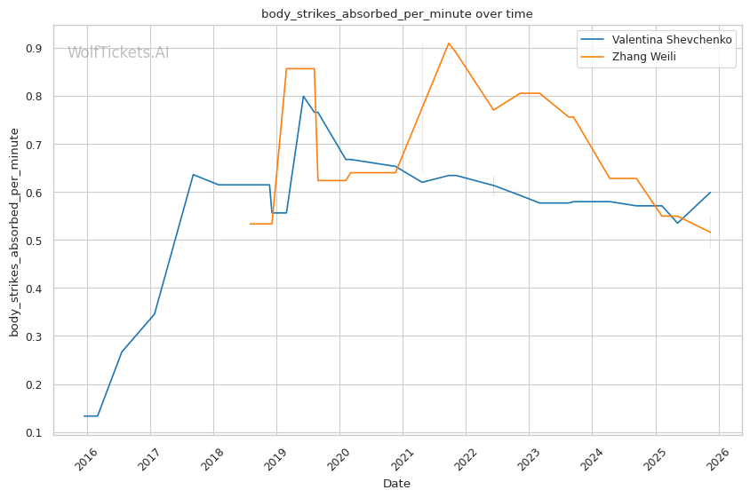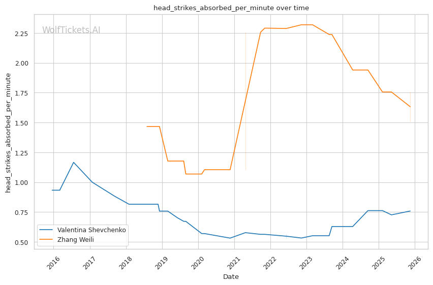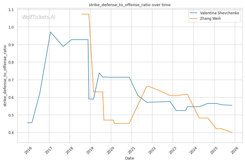 Striking defense percentage increased the score by 1.0: Shevchenko's 41.6% overall (46.2% recent) versus Weili's 47.8% (53.9% recent) shows Shevchenko absorbs more strikes—concerning given Weili's volume approach.