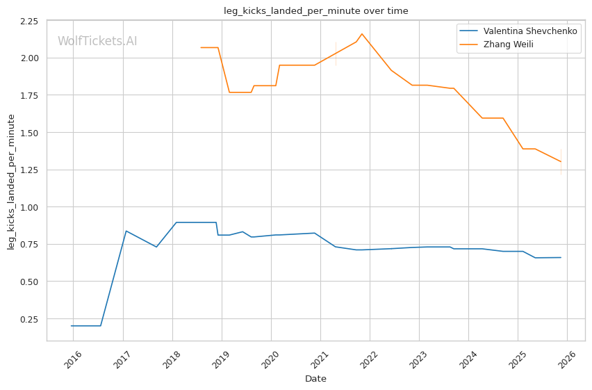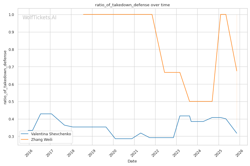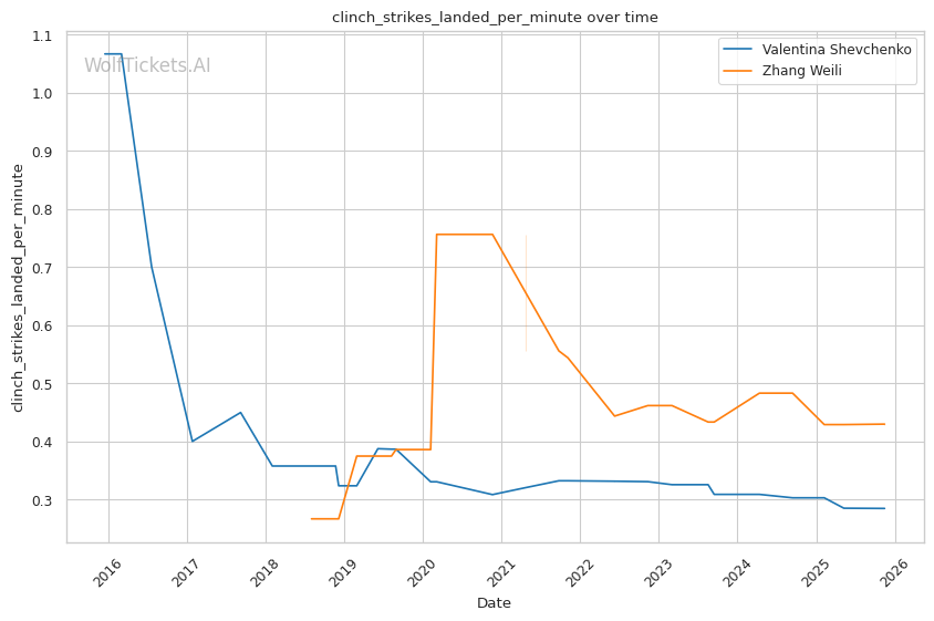 Both fighters show 30-35% takedown defense, meaning scrambles will occur. Shevchenko averages 2.62 takedowns per fight versus Weili's 2.24, but Weili's recent grappling evolution (knee-cut passes, leg attacks, crucifix control) suggests more dangerous top position. Shevchenko's Judo throws from the clinch versus Weili's body lock takedowns creates interesting dynamics, but Weili's ability to maintain top control (see: Lemos fight, 218-21 strike differential) gives her the edge in extended ground exchanges.