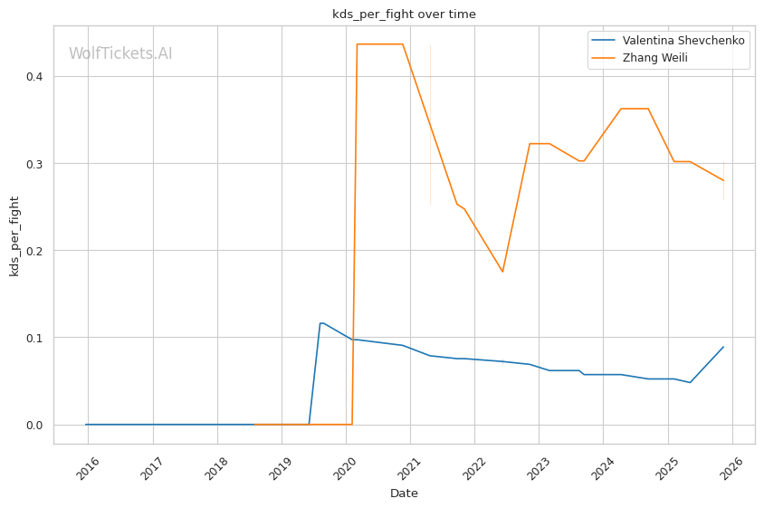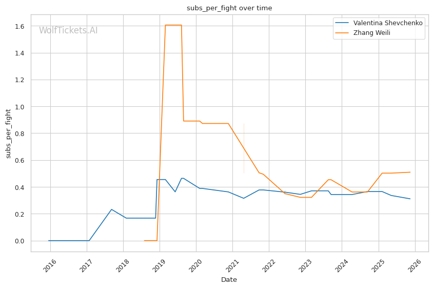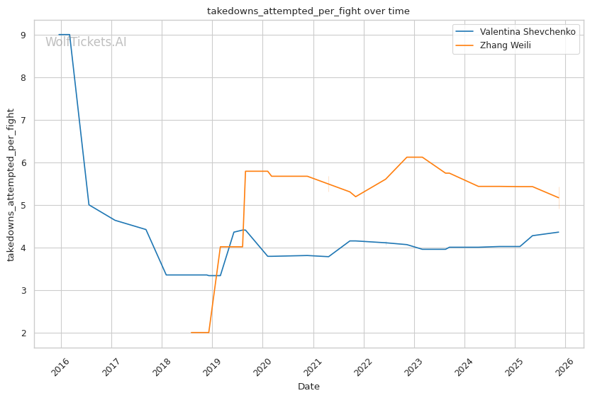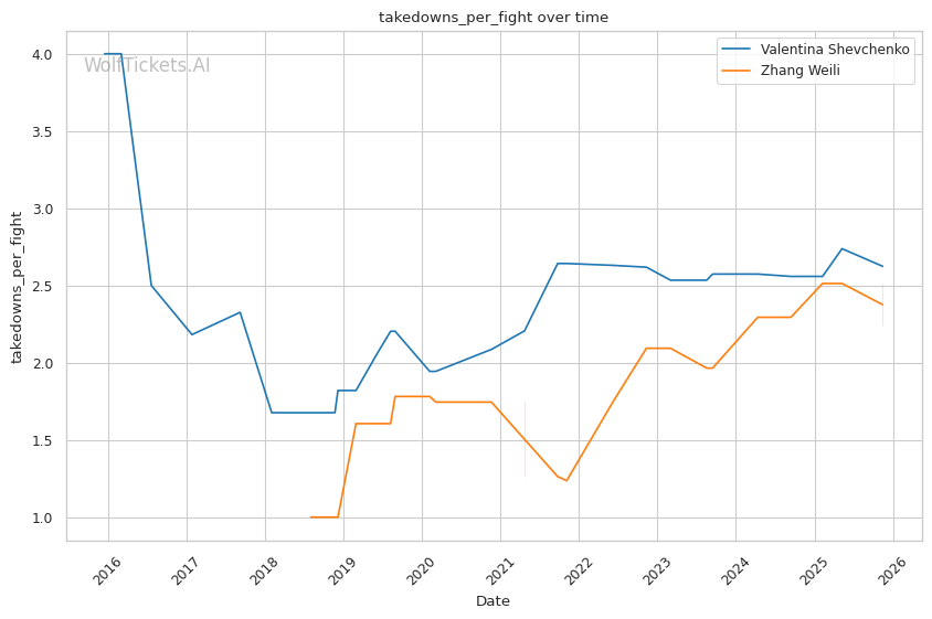 Recent takedowns attempted per fight increased the score by 1.0: Shevchenko's 4.64 attempts versus Weili's 5.78 suggests grappling activity, though Weili's higher attempt rate could indicate more aggressive pursuit.