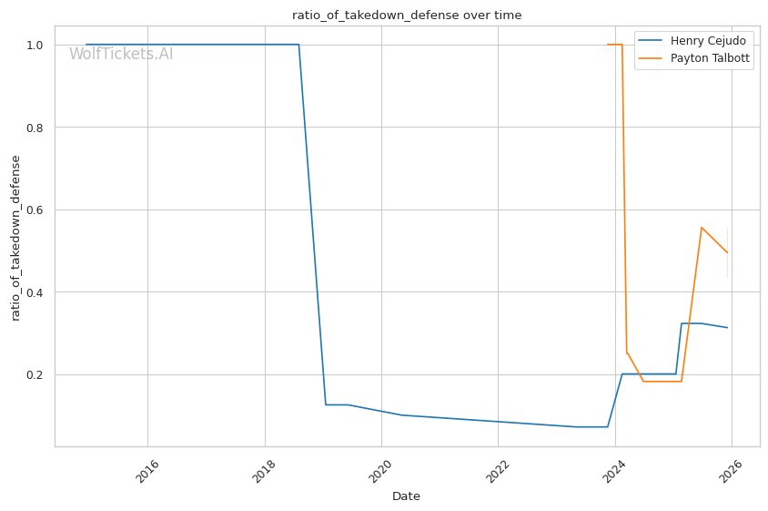 Cejudo's inside trip from body lock could theoretically exploit Talbott's high stance. If Cejudo can close distance and secure the clinch, his wrestling should translate to control time. However, against Yadong—who has "exceptional takedown defense"—Cejudo struggled to implement his wrestling. Talbott's framing and limp-leg defense may prove sufficient against Cejudo's 38-year-old shot speed.