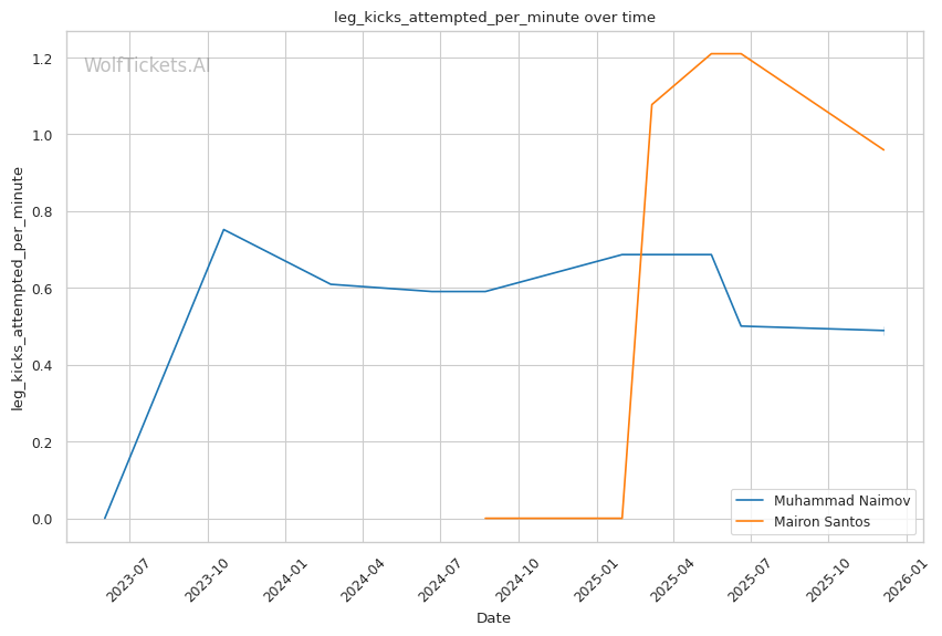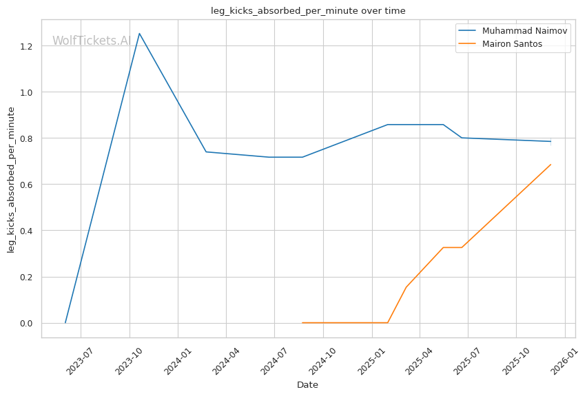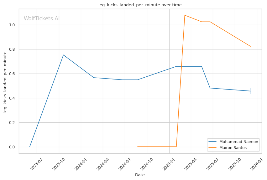Calf kick exchanges could determine the fight. Both fighters have shown vulnerability to leg attacks. Naimov was dropped by Marshall's calf kicks; Santos was swept by them. Whoever establishes leg kick dominance early gains a significant advantage.