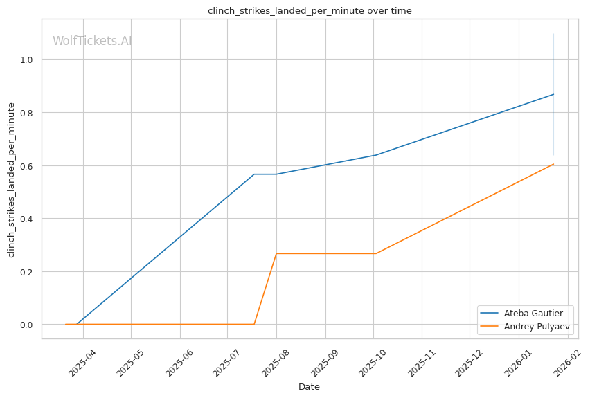 Gautier's weapons vs. Pulyaev's gaps: - Gautier's clinch knees and elbows directly target Pulyaev's demonstrated inability to escape cage pressure. Against Klein, Pulyaev had no answer when pinned with an underhook—Gautier is far more dangerous in that position. - Gautier's 81-inch reach versus Pulyaev's 78-inch reach means Pulyaev will need to close distance against a fighter who punishes entries with elbows and knees. - Pulyaev's 29.75% recent significant striking defense against Gautier's power is a nightmare scenario.