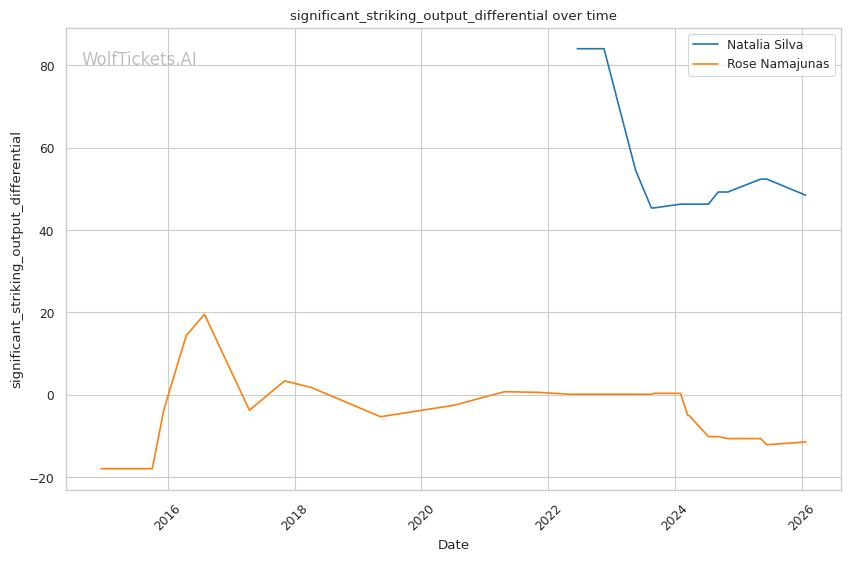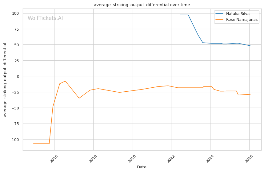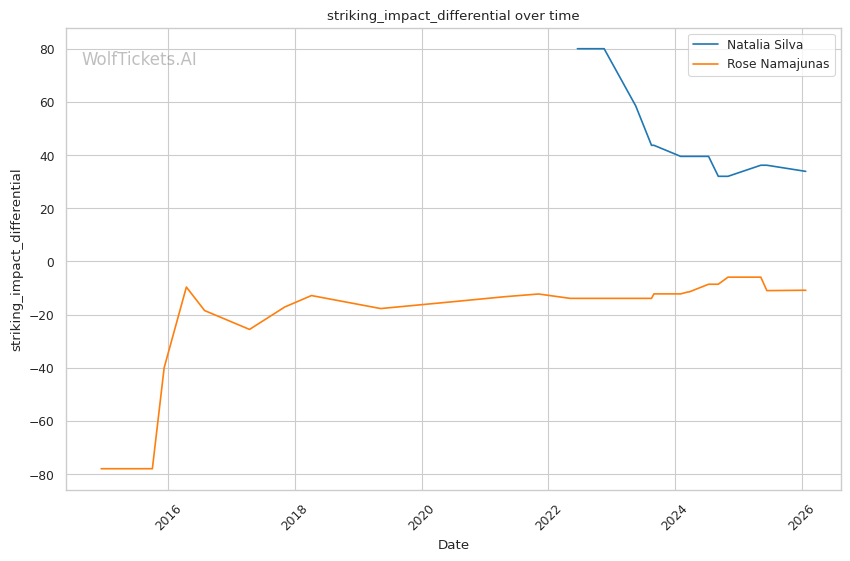 Striking defense percentage (+1.0) favors Silva's ability to avoid damage while landing. The only negative factor was average striking output differential (-1.0), suggesting Rose's total volume could be competitive even if her impactful strikes lag behind.