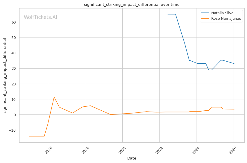 Recent significant striking impact differential (+2.0) and striking impact differential (+2.0) reinforce that Silva's volume and accuracy advantages are current, not historical artifacts. Her TrueSkill rating (+1.0) reflects her unbeaten UFC run against increasingly difficult competition.