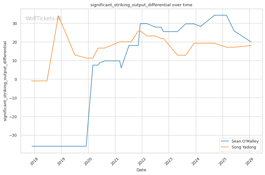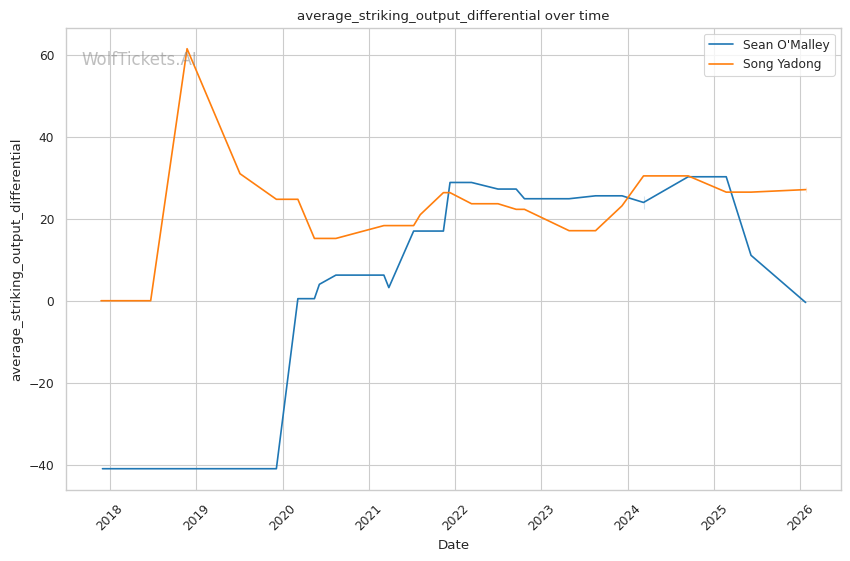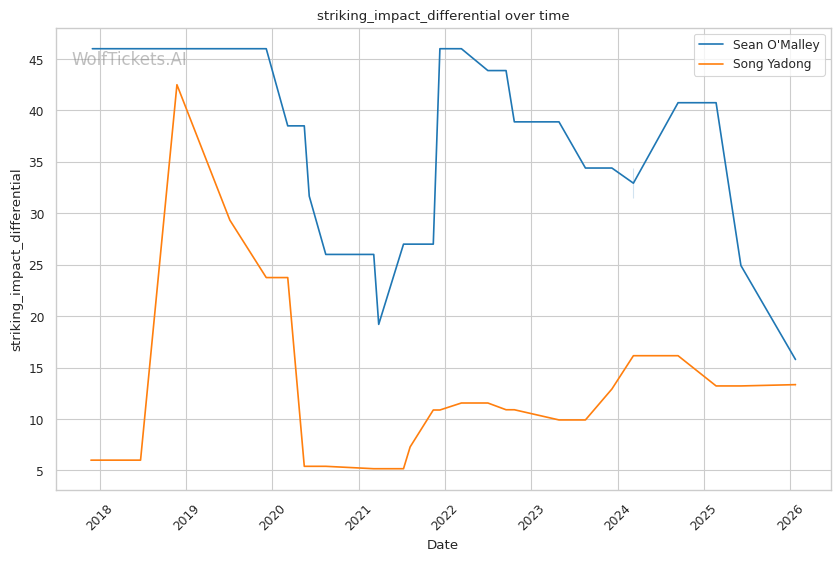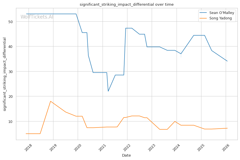 Significant Striking Impact Differential increased the score by 8.0 — O'Malley's 34.07 differential versus Yadong's 7.53 shows O'Malley lands with more damage relative to what he absorbs.