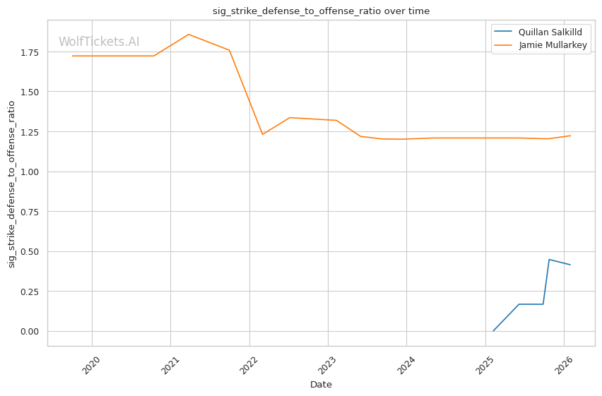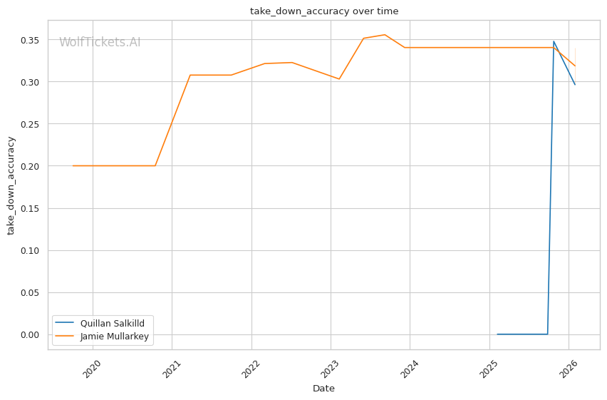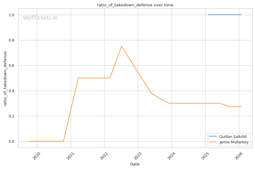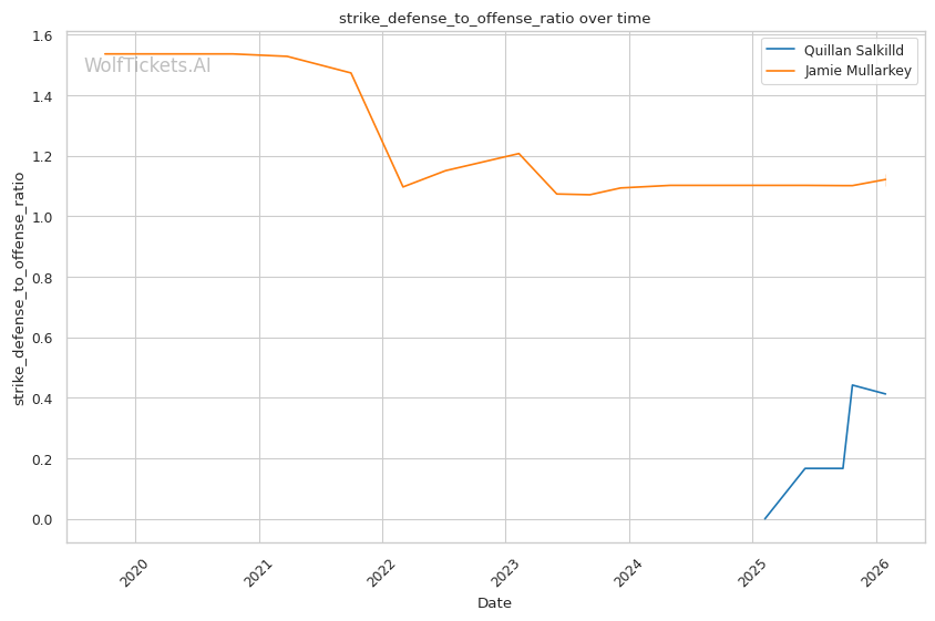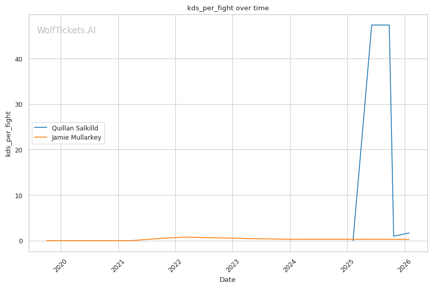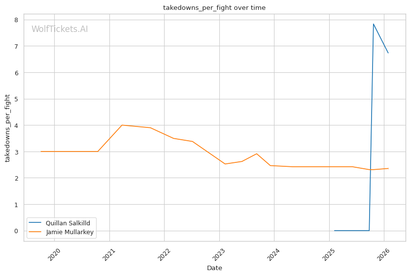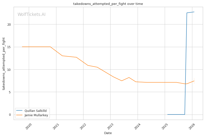 Salkilld's takedown threat could freeze Mullarkey's forward movement. Mullarkey's takedown defense ratio of 0.27 is concerning, and while Salkilld's wrestling execution needs work, the threat alone disrupts opponents.