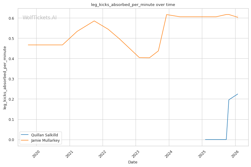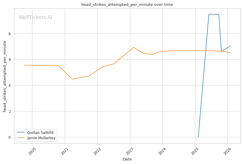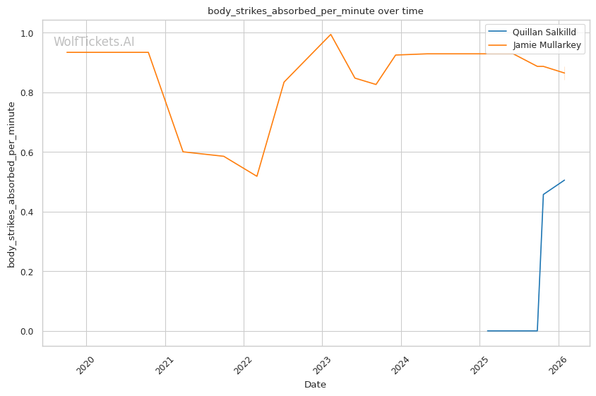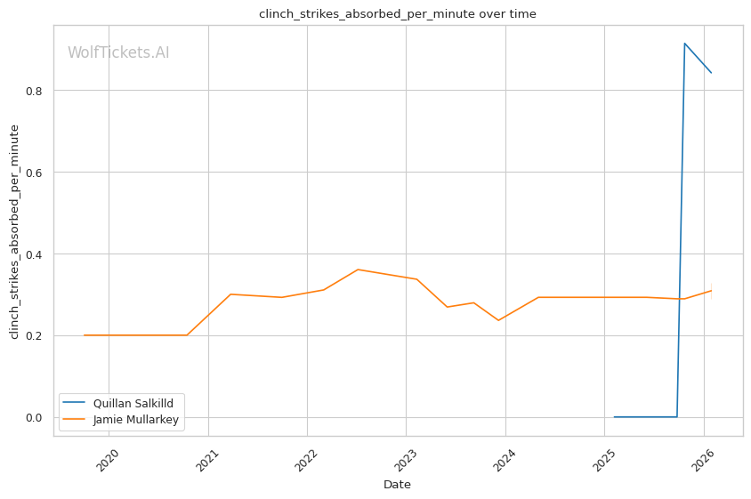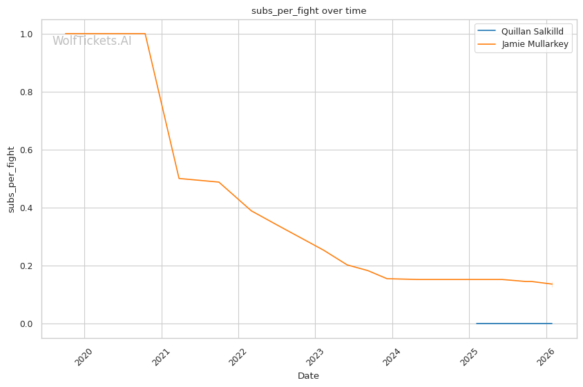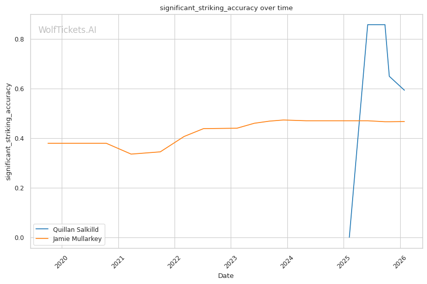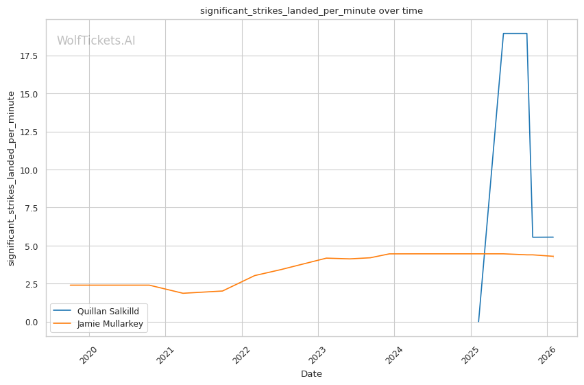 Salkilld's takedown threat could freeze Mullarkey's forward movement. Mullarkey's takedown defense ratio of 0.27 is concerning, and while Salkilld's wrestling execution needs work, the threat alone disrupts opponents.